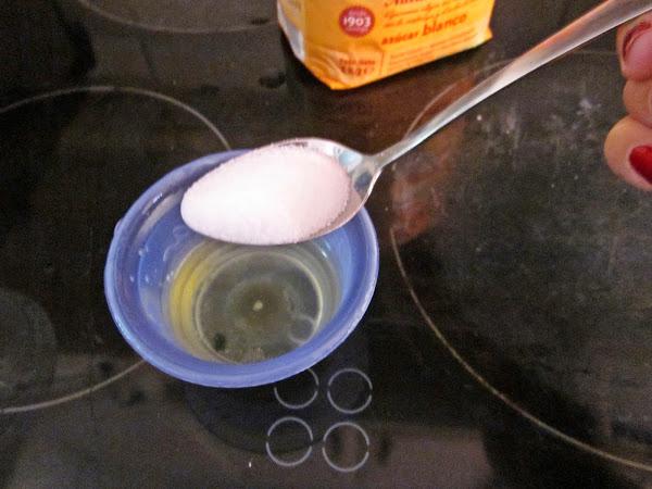 A continuación, vamos completando el recipiente con el azúcar. Yo aquí eché unas 5 cucharadas, pero al igual que con el aceite, si veis que os quedáis cortos, podéis ir completando.