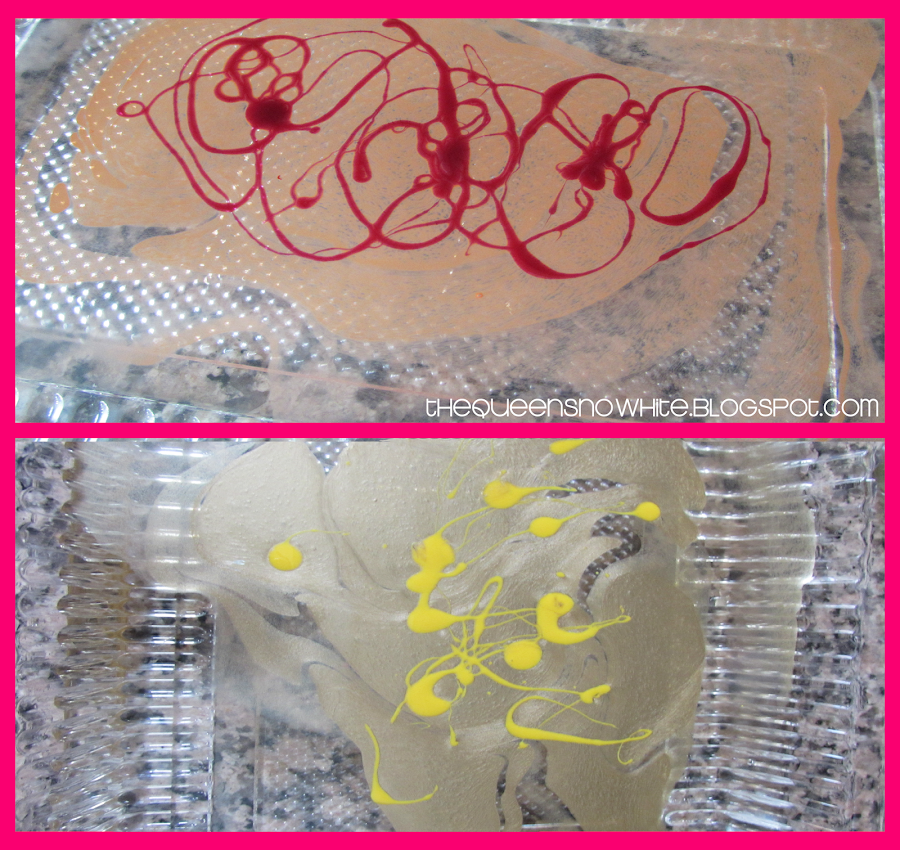 2) Luego vamos a colocar gotas de esmalte en el agua, y con ayuda del palillo vamos a desparramarlos y mezclar los colores que pusimos. Una vez que usan el palillo lo colocan en una servilleta para no ensuciar.