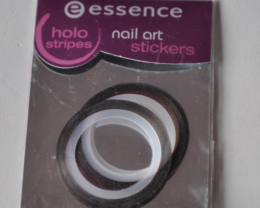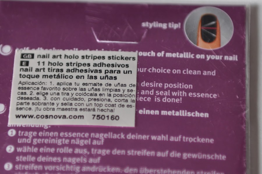 En este paquete se incluyen 3 "royos" de cinta decorativa en tonos metalizados:dorado,plateado y rosado.Se aplica con mucha paciencia,en mi caso me ayudo de las pinzas de depilar para poder sujetar el trozo que corto de cada royo y a continuación pegarlo en la uña.