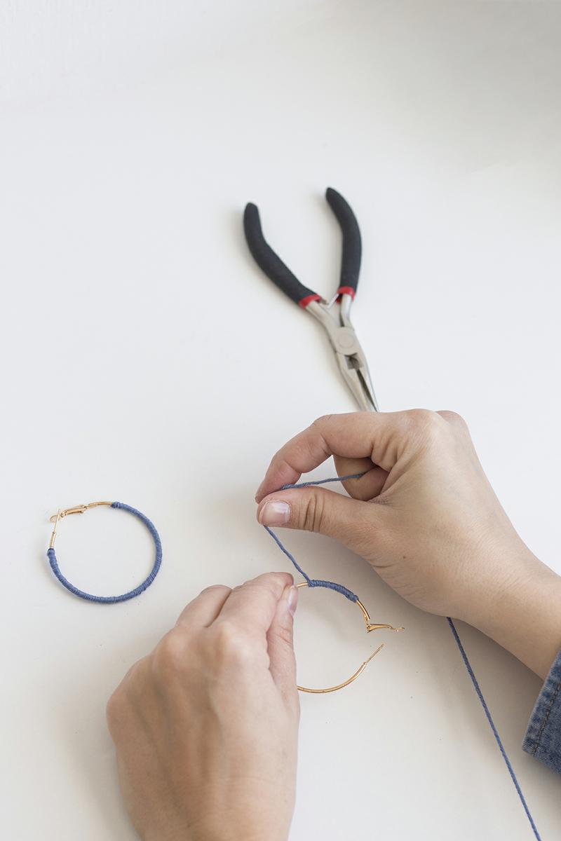Enrolla la lana en el arete. Pon una gotita de pegamento instantáneo al principio y al final de la lana para que quede sujeto.