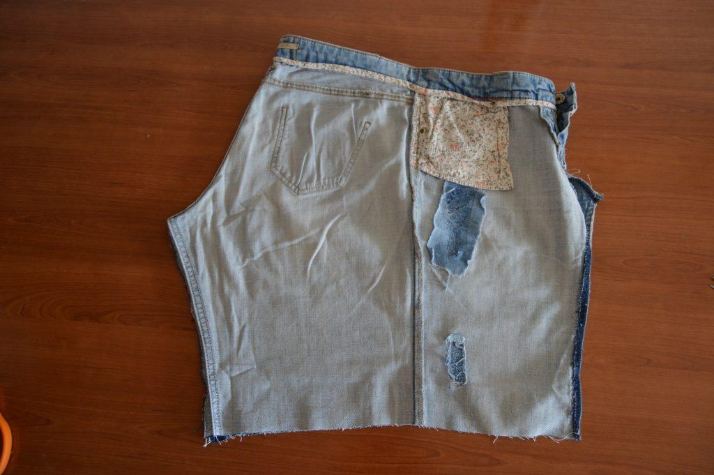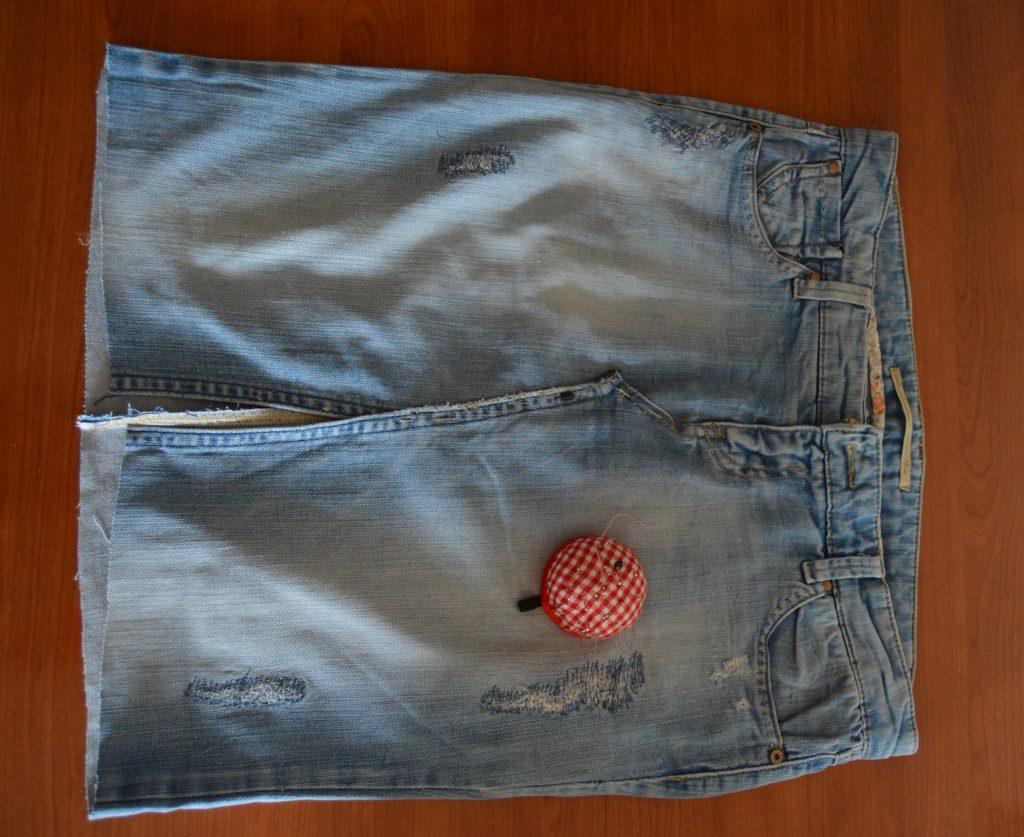 Ahora vamos a marcar el largo deseado de la falda. Podemos hacerlo de varias maneras, la más conveniente es ponernos el vaquero y marcar el largo por donde queramos.