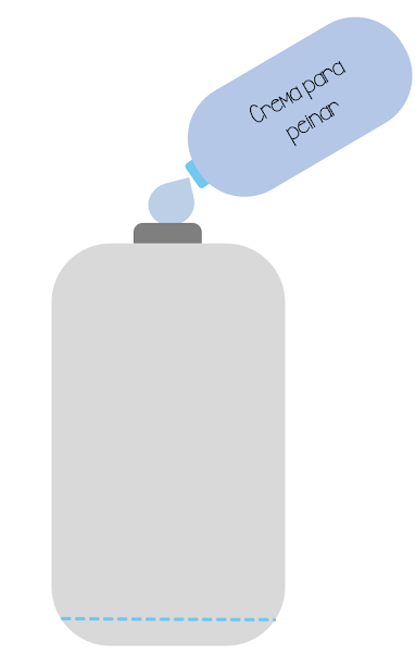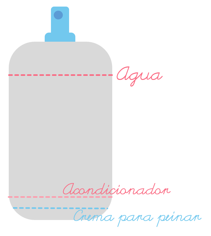 Nuestro desenredador se compone de: Crema para peinar y/o acondicionador, y agua. Lo vamos a depositar en un recipiente de spray.