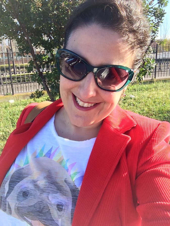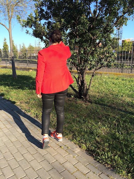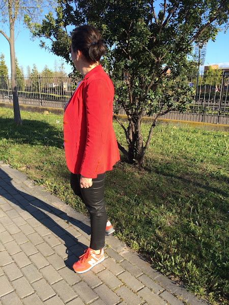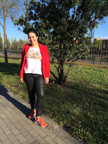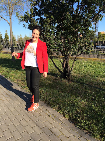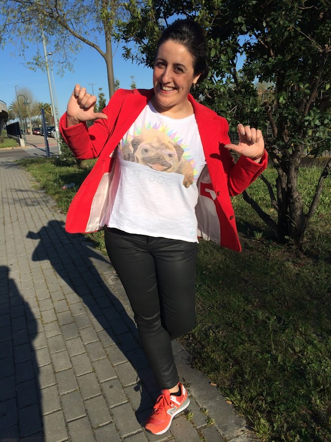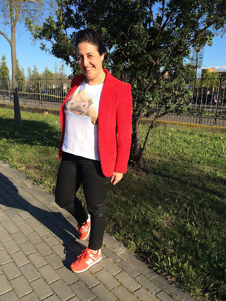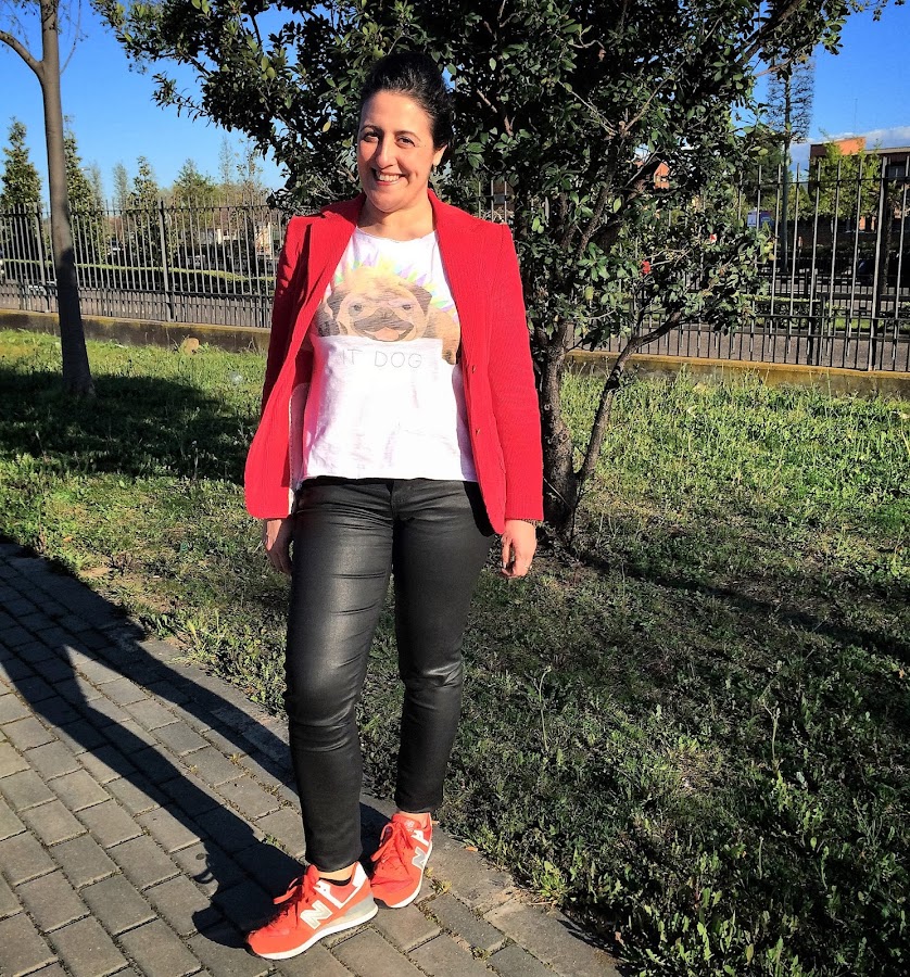 La combinación es un pantalón efecto piel de cowestjeans, una blazer de pana en rojo de tienda local de hace ya unos años, con mi camiseta de dog y mis new balance.
