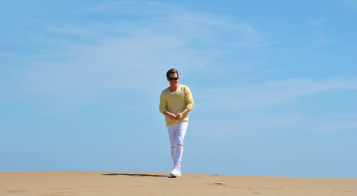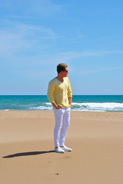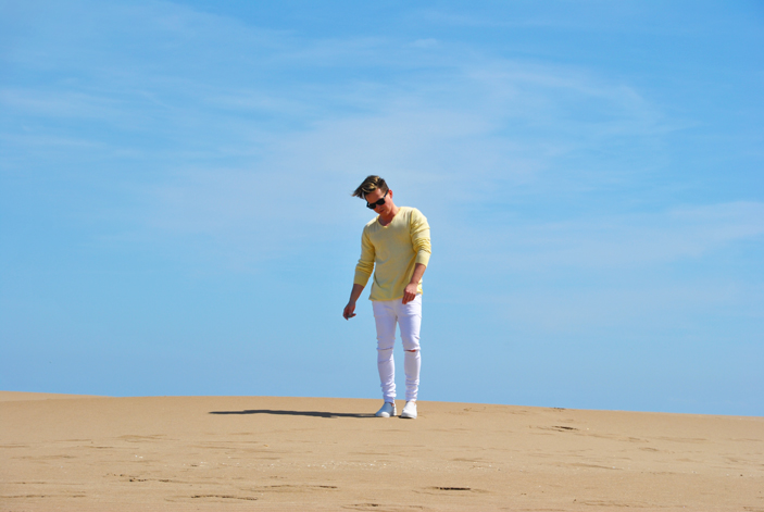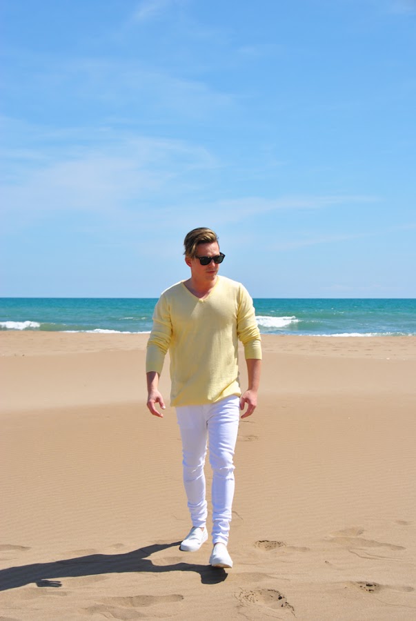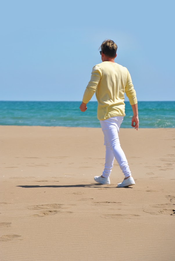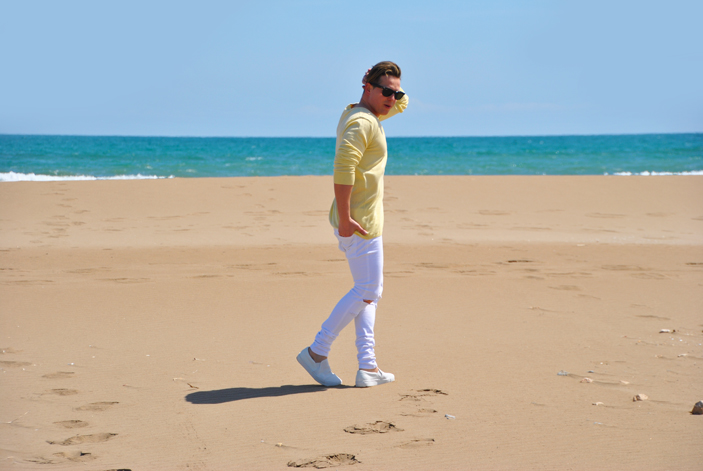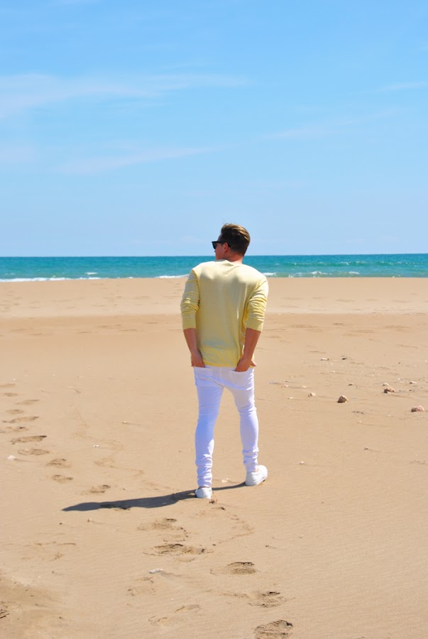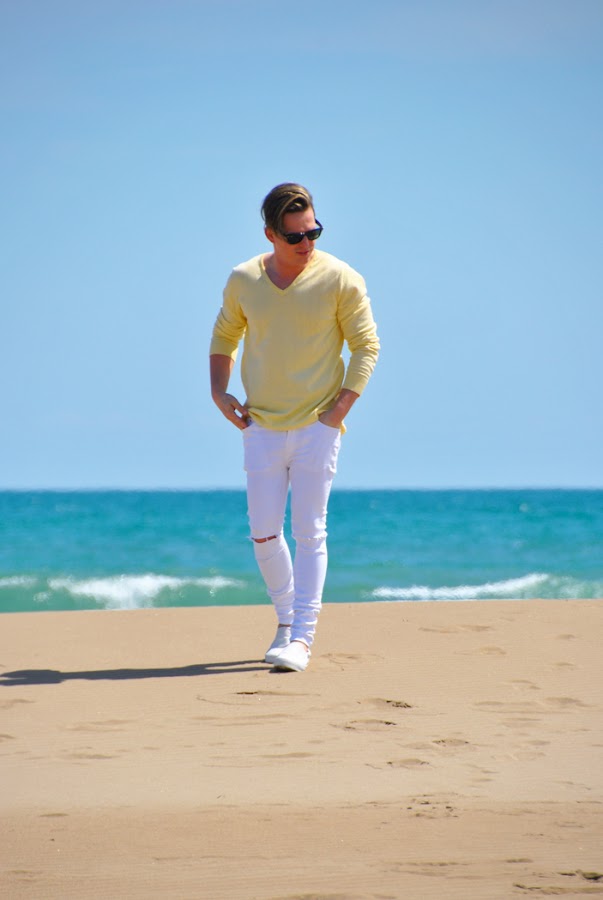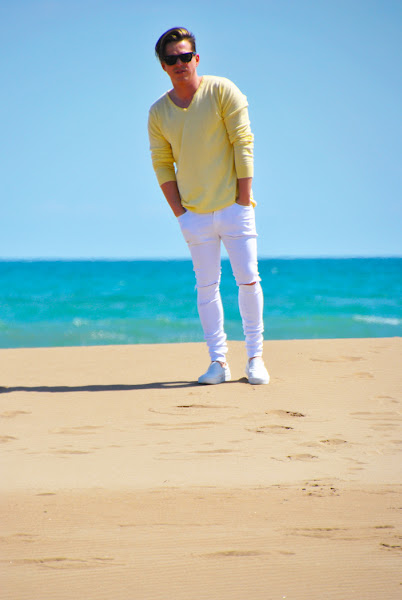 Llevo un sweter súper fino color ocre de Bershka y unos jeans elásticos blancos de la misma marca. En los pies unas sneakers sin cordones totalmente blancas. Como siempre un look muy sencillo y cómodo.