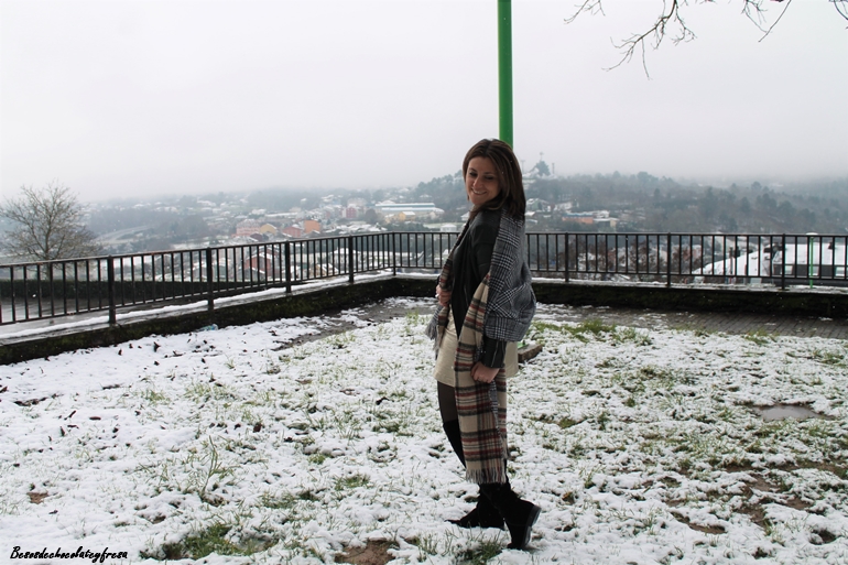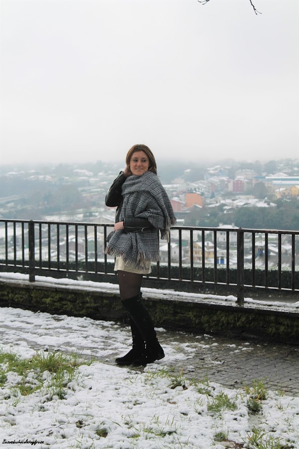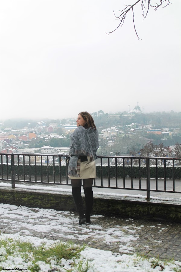 En esta ocasión, en una estampa totalmente navideña cubierta por una capa de nieve, llevo falda dorada con camiseta de leopardo en negro, biker, botas XXL y bolso en negro con bufamanta a modo de mantón reservible en estampado tartán.
