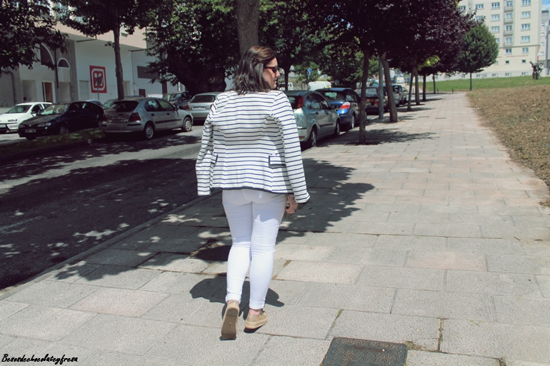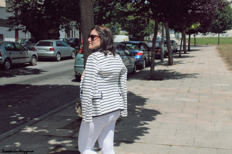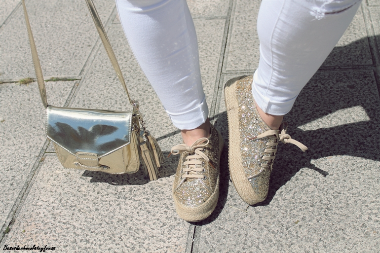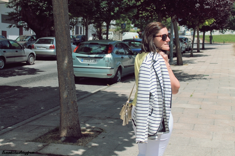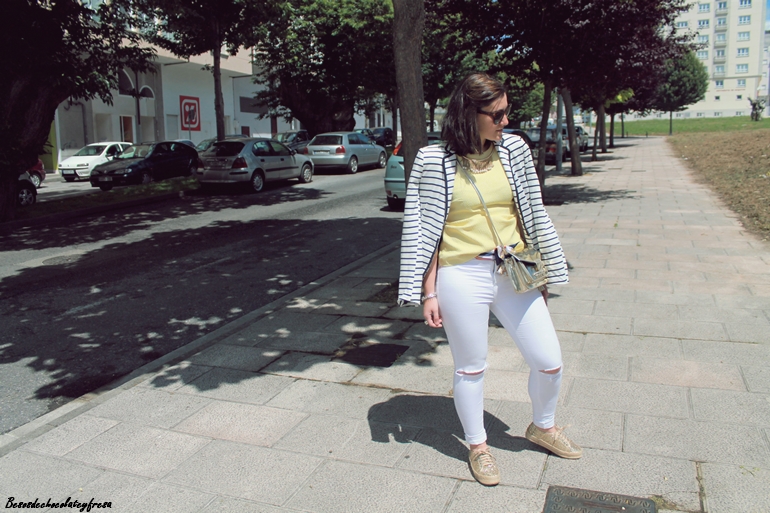 Para esta ocasión decidí combinar el amarillo con blanco en los jeans, toques dorados en las espadrilles con mucho mucho brillo, en el bolso y en el collar con perlas. Y para romper un poco con los colores claros, aposté por el azul marino con el pañuelo a modo de cinturón con motivos muy navy junto con la blazer, de hace varias temporadas pero que me encanta la personalidad y elegancia que aporta a los estilismos.