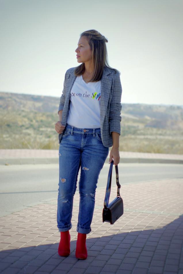 Blazer El primer look, es casual, para el día a día. He combinado la blazer con jeans y una camiseta con el logo del Blog , los zapatos que escogí son otro de los accesorios claves del otoño… los botines rojos, como siempre me gusta agregar color a los outfit si estos no llevan casi color, así que nada mejor que estos; además una minbandolera, que como sabemos ahora también se llevan los bolsos en versión mini.
