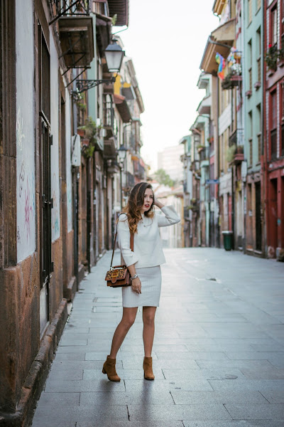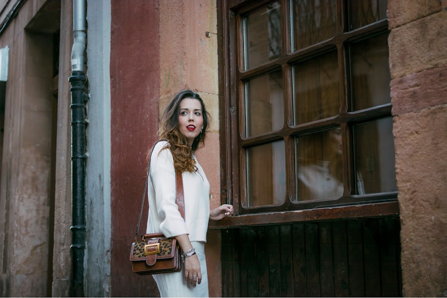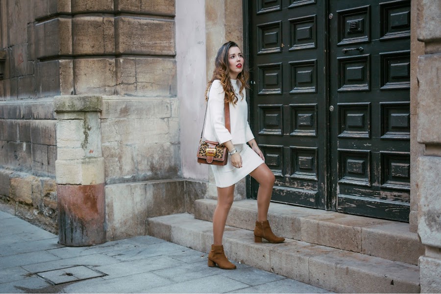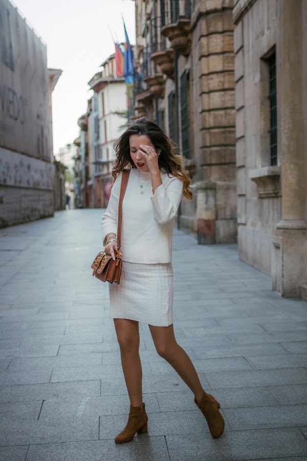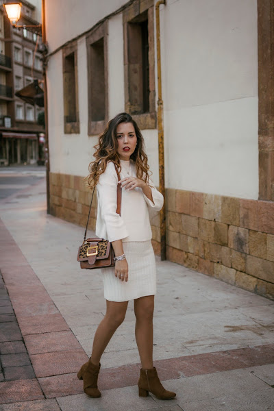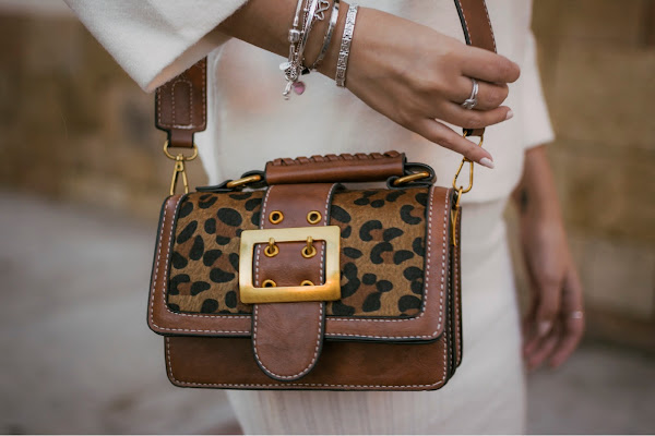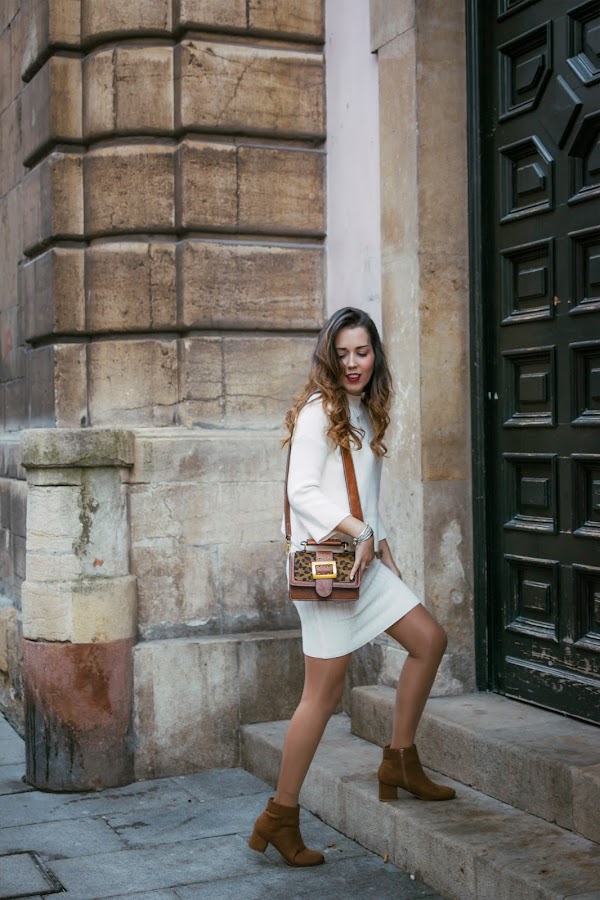 Creo que este va a ser uno de los conjuntos que más repita esta próxima temporada, lo veo ideal para la Primavera que está a la vuelta de la esquina, bueno, un poco más allá de la esquina. Es un conjunto de dos piezas, consta de un vestido y un sweater en un punto súper suave, ambos con diferente textura para crear contraste. Cuando estaba haciendo las fotos, quería recordar hacer una de modo que pudieseis ver que el vestido es con escote en v y tirantes, por lo que es súper bonito también para llevarlo solo o también, utilizar el sweater con unos vaqueros, pero se me olvidó. El conjunto podéis encontrarlo en Rosegal. Para seguir con los tonos cálidos, me decanté por unos botines con tacón gordito en color marrón de ante. También de la misma marca, un bolsito en color marrón, con detalles de animal print y correa ancha. Aunque es pequeñito, caben muchas cosas y además, perfectamente organizadas ya que en el interior, tiene diferentes departamentos.