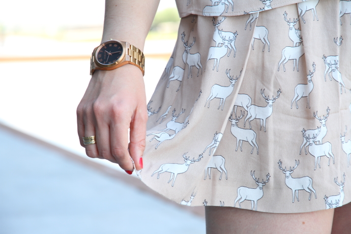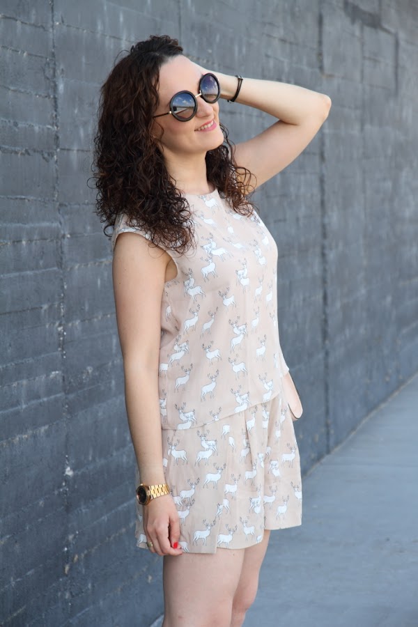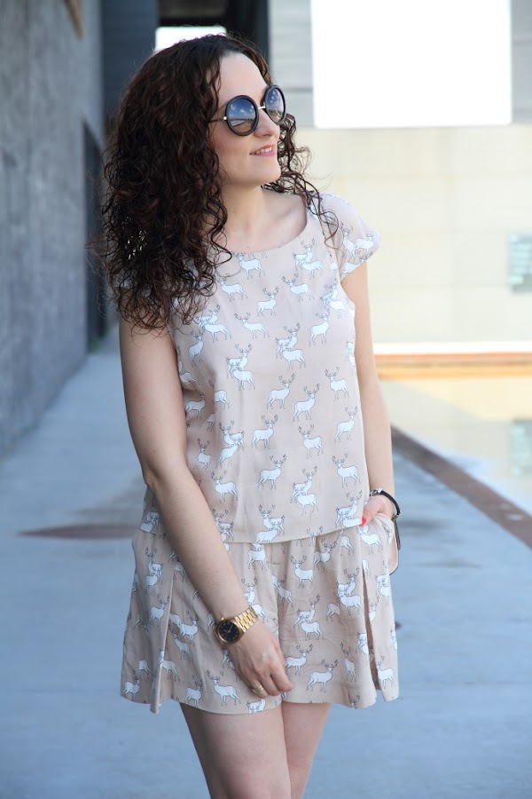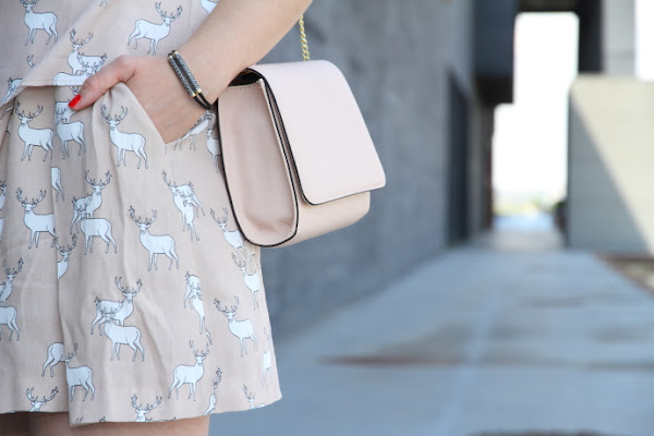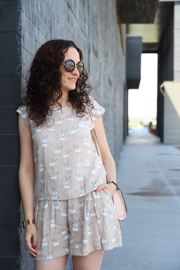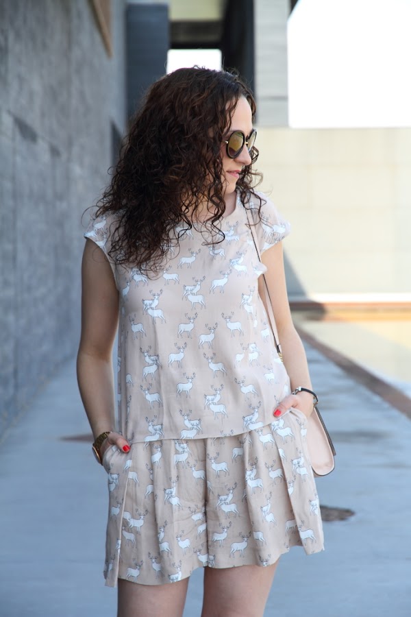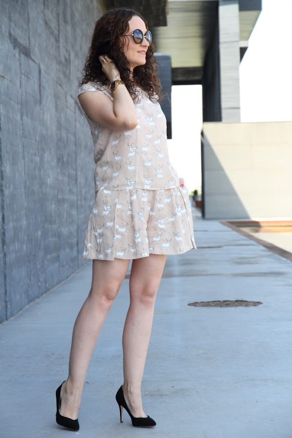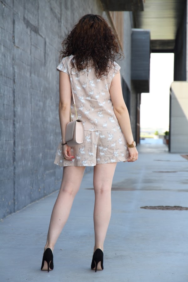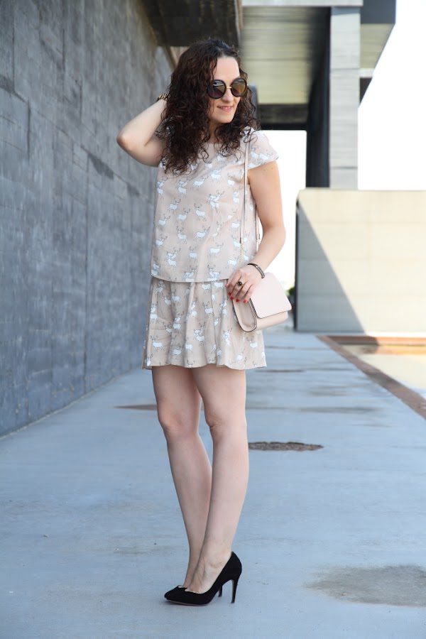 Tal y como os adelanté la semana pasada, las fotos de hoy son con el conjunto de dos piezas de ciervos que os he ido enseñando por separado aquí y aquí. Esta vez me lo puse con unos stilettos negros, después de todo el verano con sandalias y casi siempre de plano se me hizo hasta raro volver a calzarme unos taconazos, pero creo que es como más se luce este conjunto. Además, para el bolso opté por este en tono nude que tanto juego me está dando últimamente al ser tan combinable.