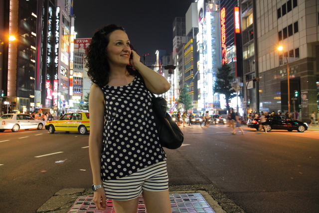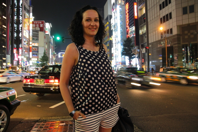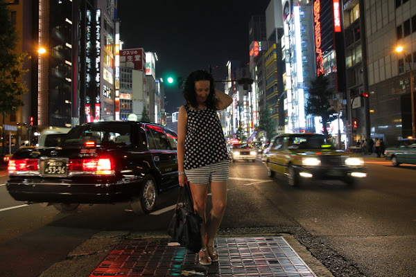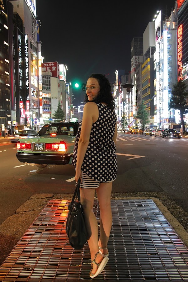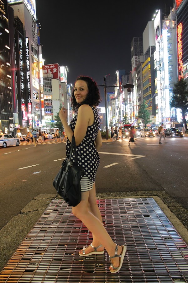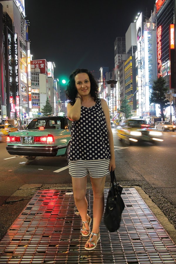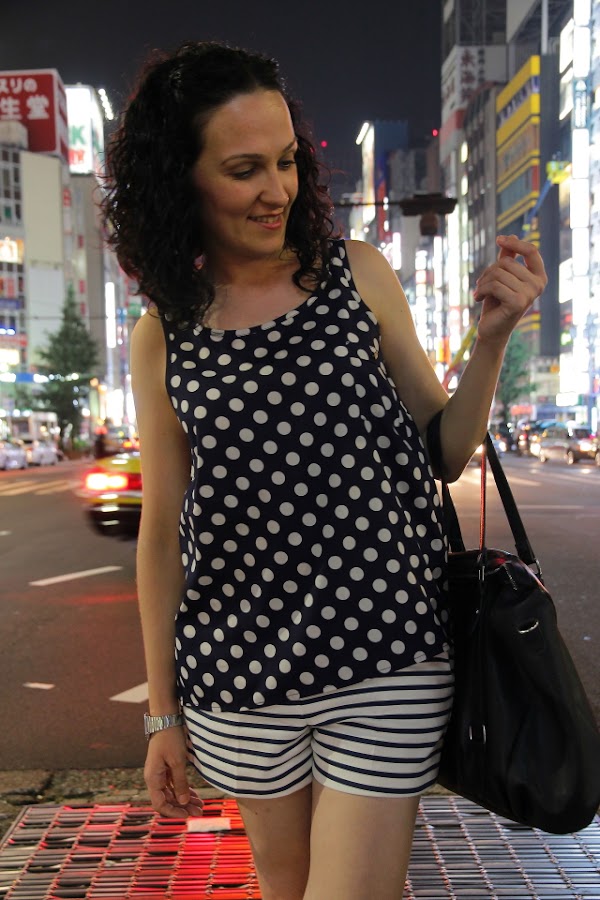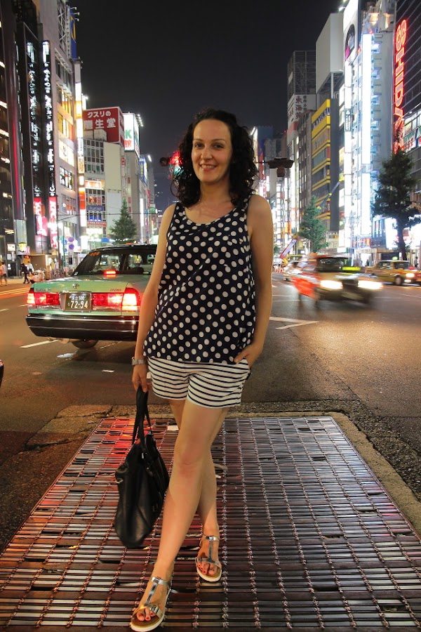 Nuevo post de mis vacaciones en Japón, esta vez desde Tokio, la ciudad de las luces de neón. Las fotos de hoy las hicimos en el barrio de Shinjuku, lugar donde nosotros teníamos el hotel. Actualmente Shinjuku es una de las zonas de ocio más de moda ya que por la noche tiene mucha vida gracias a la gran cantidad de bares y restaurantes que allí hay. Mi cara sin maquillaje deja notar el cansancio que traía después de todo un día de turismo, pero me gustan tanto que no os podía dejar sin enseñároslas. El look que llevo con top de lunares y shorts de rayas me encanta, reconozco que es un poco arriesgado pero a veces me gusta experimentar probando nuevos combos. Lo mejor del outfit las sandalias, cuando me las llevé no sabía si serían muy cómodas pero después de los kilómetros que hice con ellas les doy más que un sobresaliente. Espero que os gusten las fotos tanto como a mi.