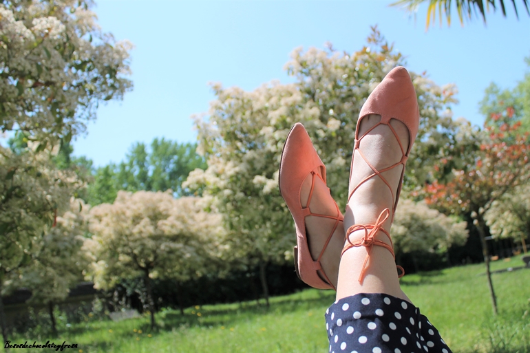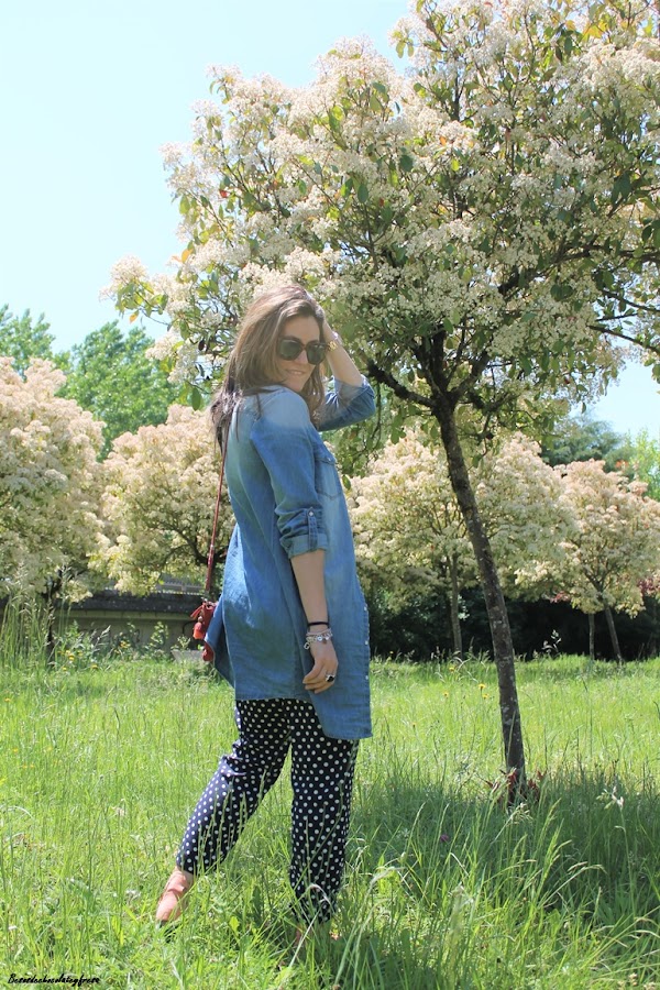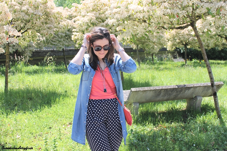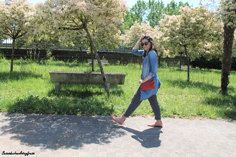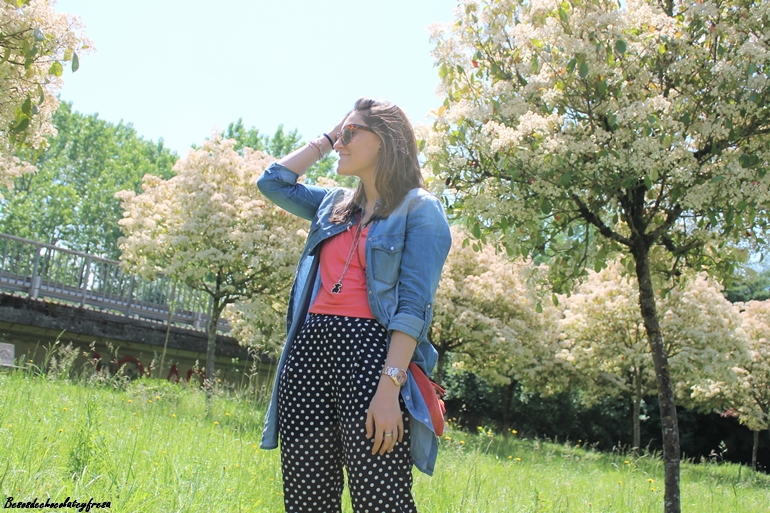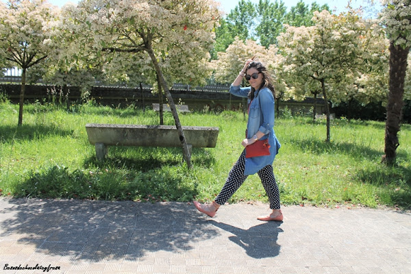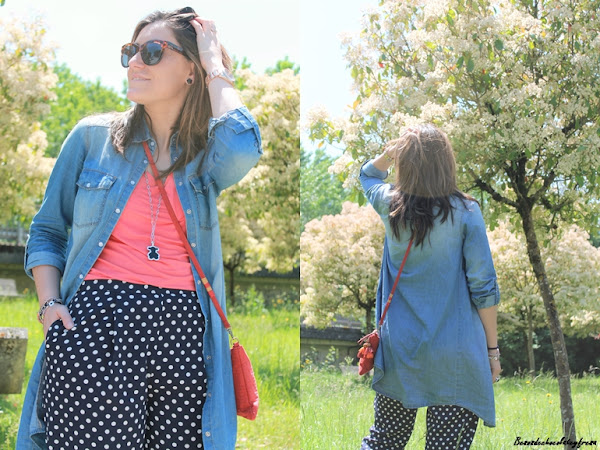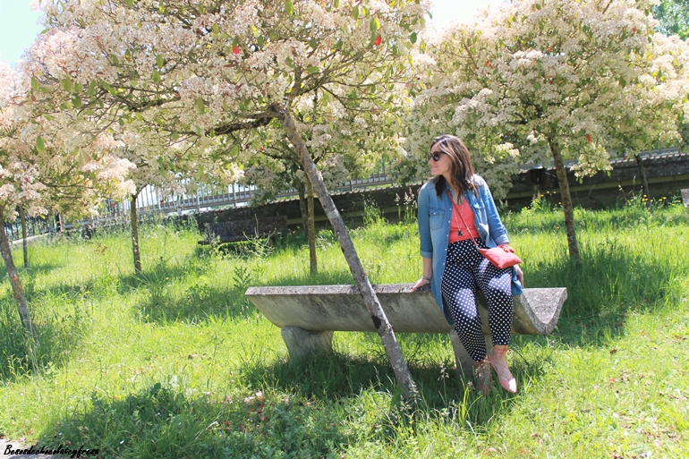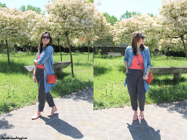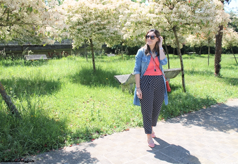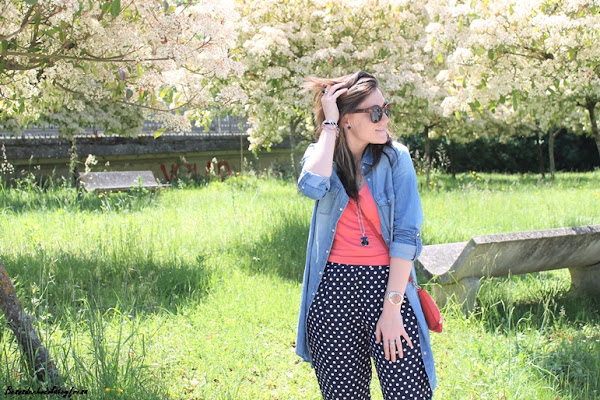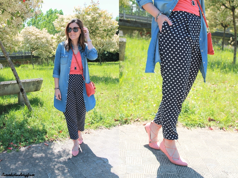 Junto con los lunares, otro de los estampados estrella del momento en los pantalones azul marino tipo pinza, que quedan perfectos tanto para llevar en clave sport con sneakers como con zapatos o sandalias combiné el color coral. En este caso aposté también por este color en los pies con zapatos lace-up (que tan de moda estuvieron el año pasado y que este año vuelven con fuerza).