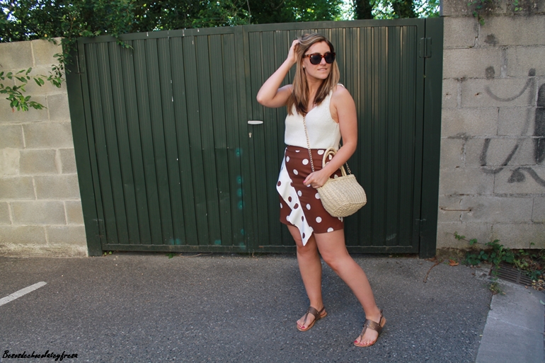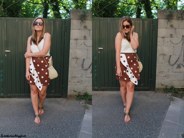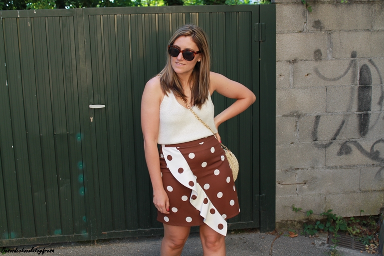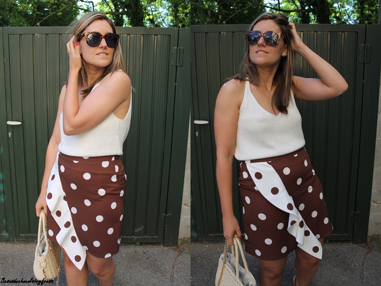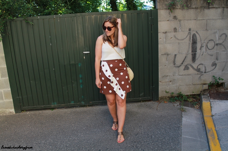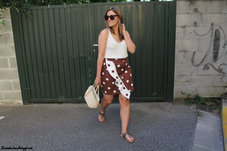 En el outfit de hoy os muestro esta falda con lunares de tamaño medio en color blanco con fondo marrón y cruzando un volante que la hace diferente, elegante a la vez que cómoda para llevar también en looks más casual