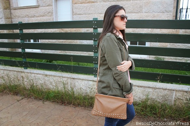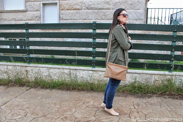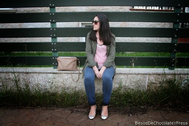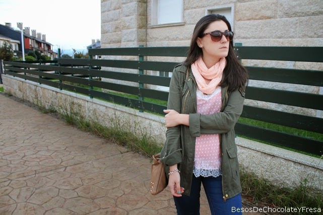 Hola!! ¿Qué tal la semana? Hoy os muestro un look en tonos salmón y verde militar. Llevo parka militar, camiseta lencera con topos, jeans y complementos en nude como las bailarinas y el bolso de tachuelas, además del fular a juego con la camiseta color salmón.