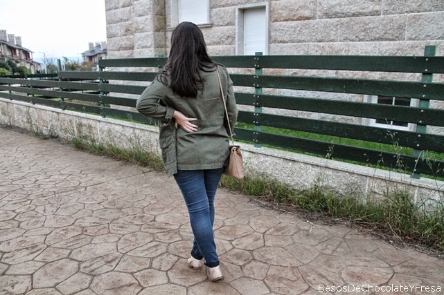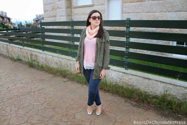 Hi !! How about a week? Today I show you a look at salmon and army green tones. Wear military parka, shirt with polka dots lingerie, jeans and accessories in nude as dancers and bag of tacks, plus matching scarf shirt salmon.
