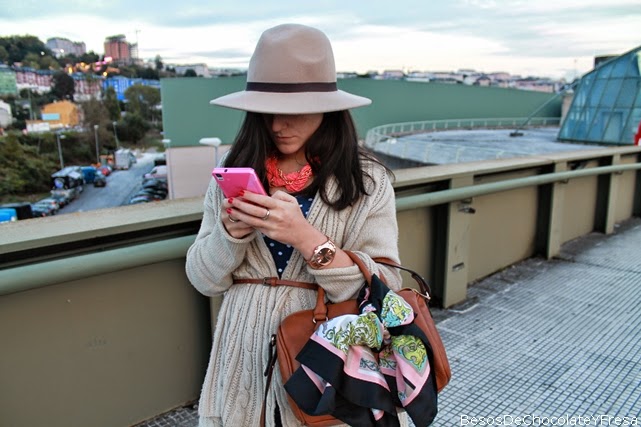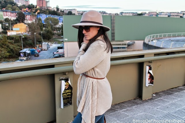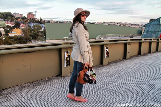 Today I teach a boho chic look and slightly warm as the temperatures have dropped a couple of gradetes. Wear body-shirt in navy and moles, jeans and nude cardigan belted waist jacket. Accessories like coral necklace with matching slippers mustache, vintage tote bag and scarf up the rest of the look.