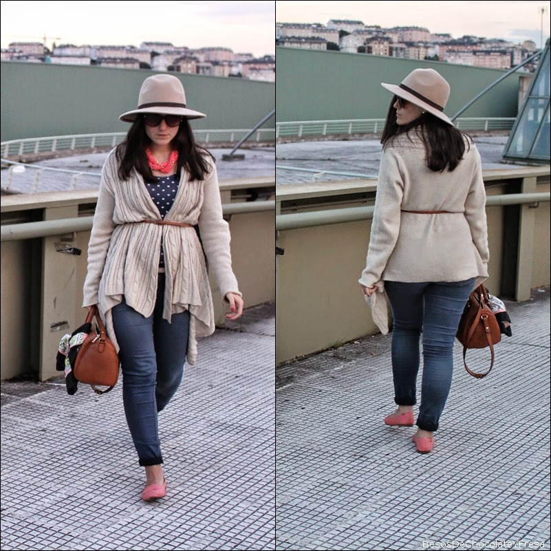 Hoy os enseño un look boho chic y algo abrigado pues las temperaturas han caido un par de gradetes. Llevo camiseta-body en azul marino y topos, jeans y chaqueta cardigan en nude con cinturón a la cintura. Complementos como el collar coral a juego con las slippers de moustache, bolso tote y pañoleta vintage componen el resto del look.
