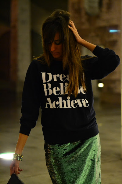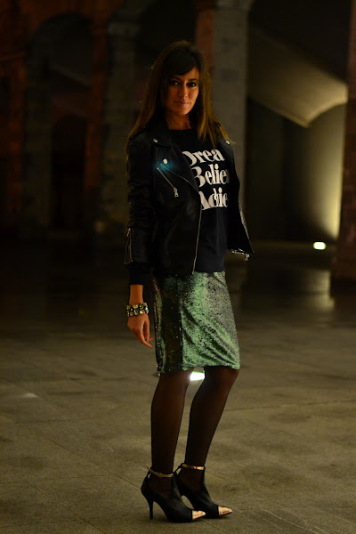 En esta ocasión, como contrapunto, para hacer más casual el look, la he combinado con una discreta sudadera de algodón con mensaje para que la falda "brille con luz propia", unos salones negros y una biker de cuero que le da ese puntito rocker que tanto me gusta.