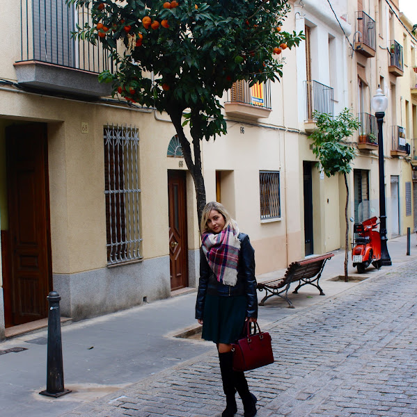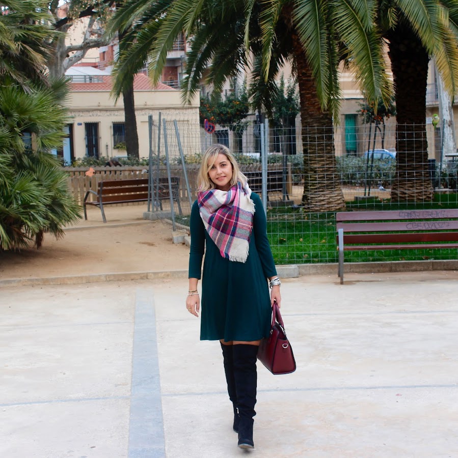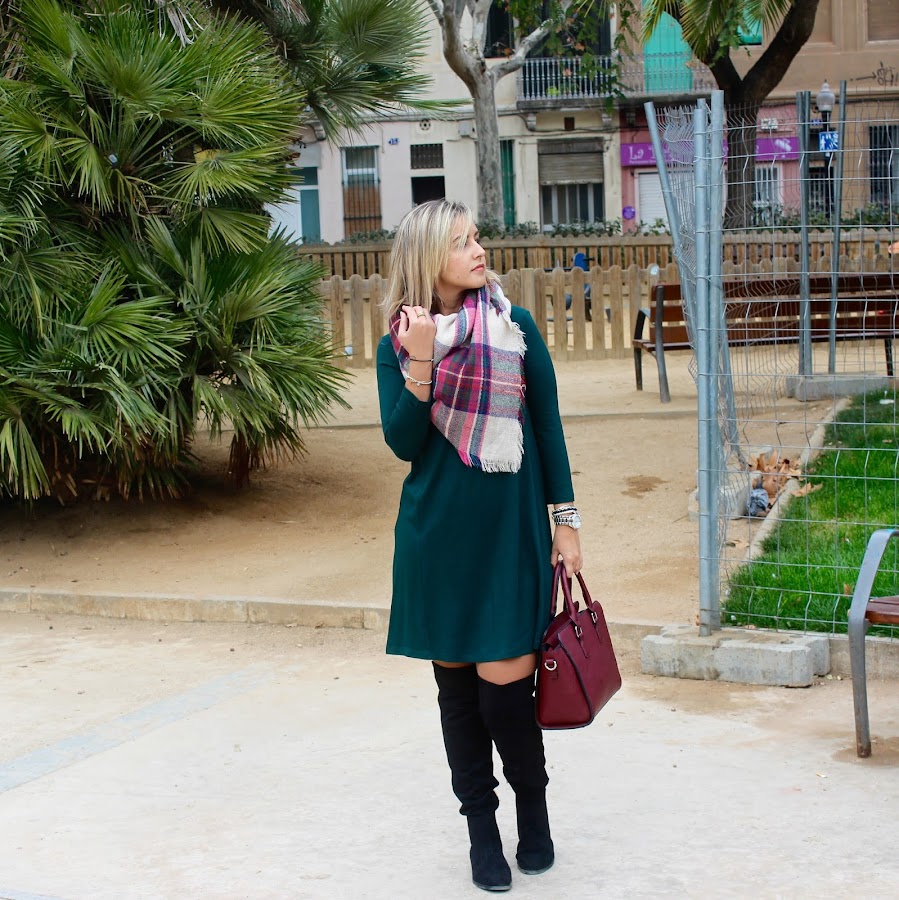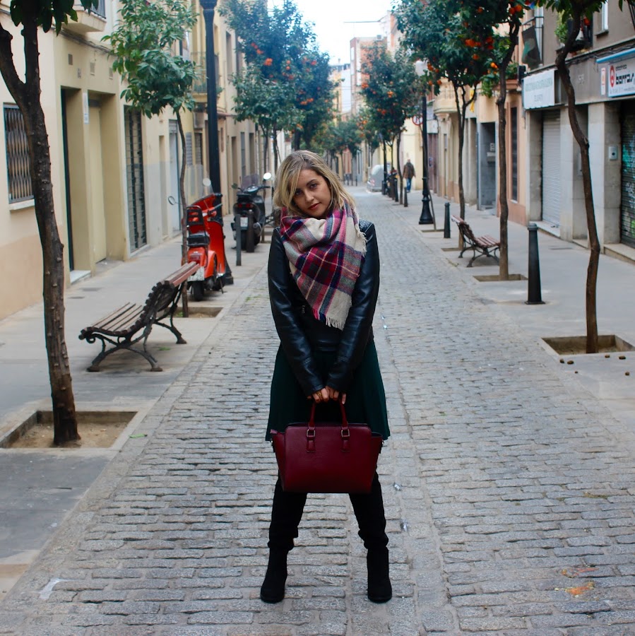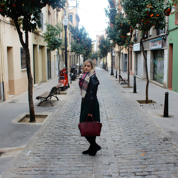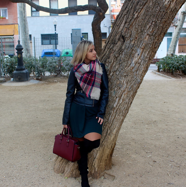 Good night! Today I show you an outfit with my last shoppings in the sales. I wore my new knit dress in green colour that I mixed it with a black biker, my new black boots over the knees and my plaid maxi scarf. A comfy and feminine outfit that its perfect to wear in our daily days.