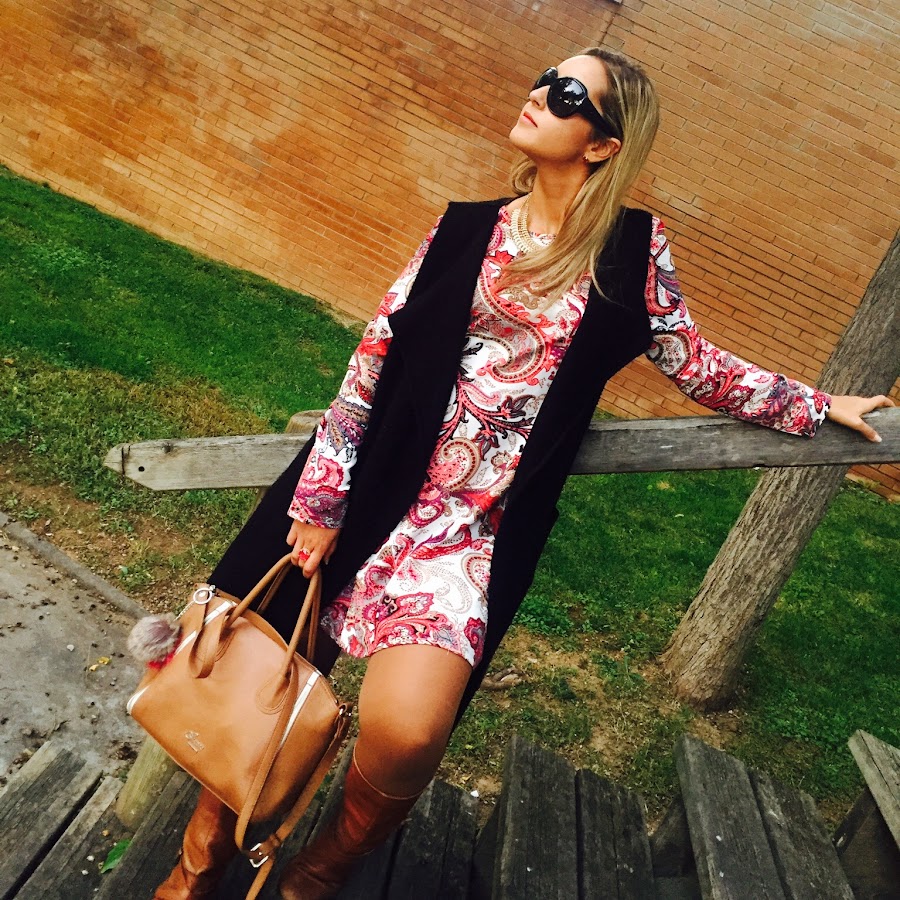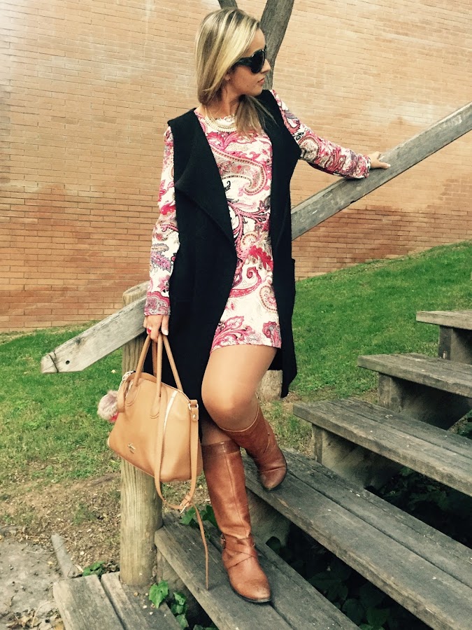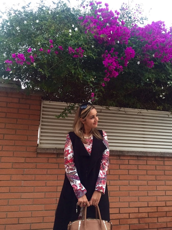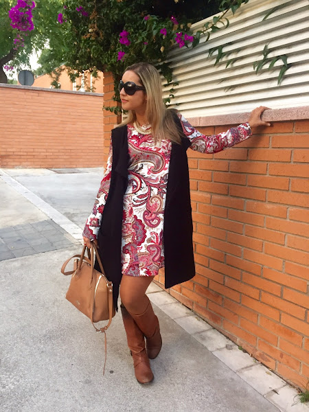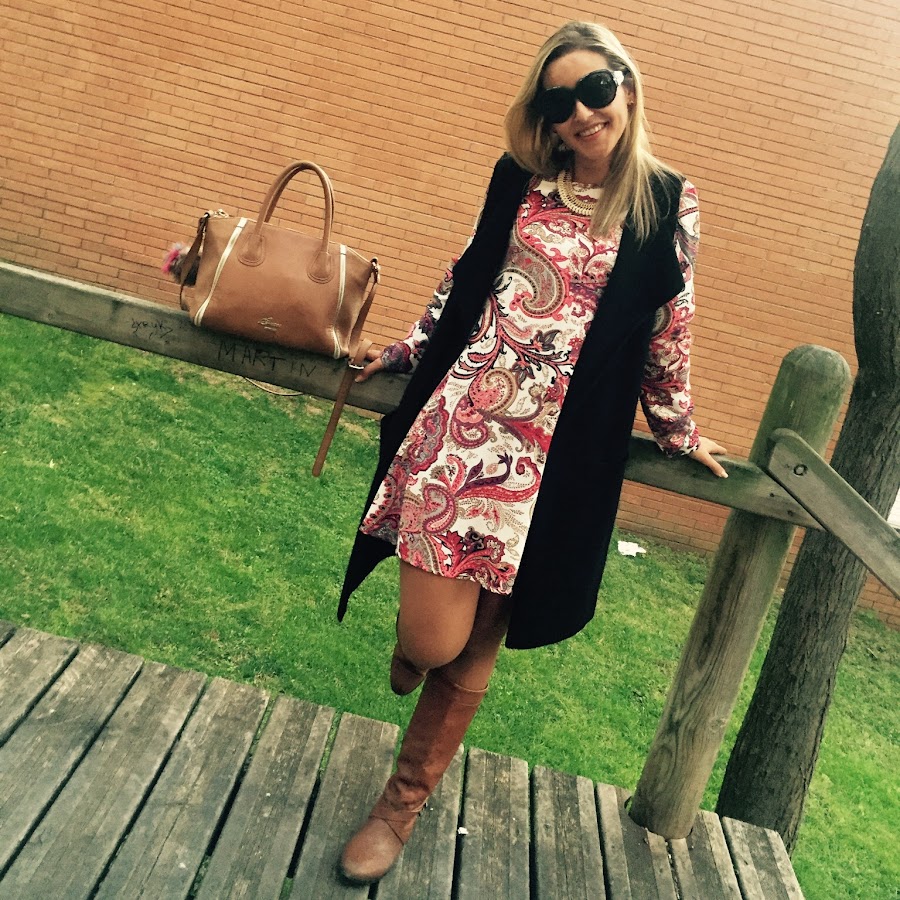 Hoy os traigo un look ideal para este tiempo, en el que todavía no hace falta llevar abrigo, aunque en nada tendremos que empezar a hacerlo. En el look de hoy combiné mi vestido con estampado de cachemir con mi abrigo negro sin mangas que desde que me lo compré no he parado de usarlo y que es una de las tendencias de esta temporada. Para completar el look añadí mis botas marrones, mi bolso de Guess y un collar sencillo.