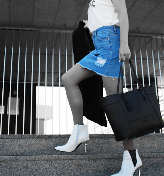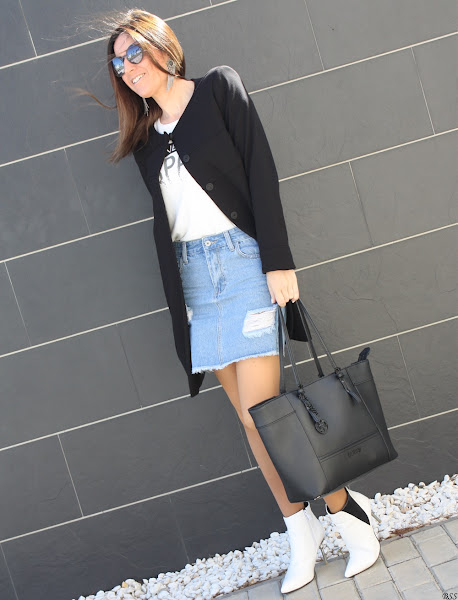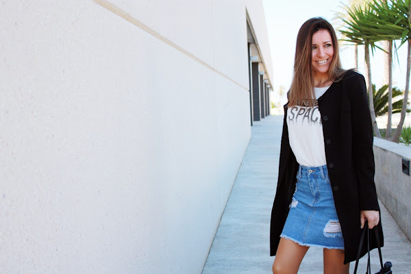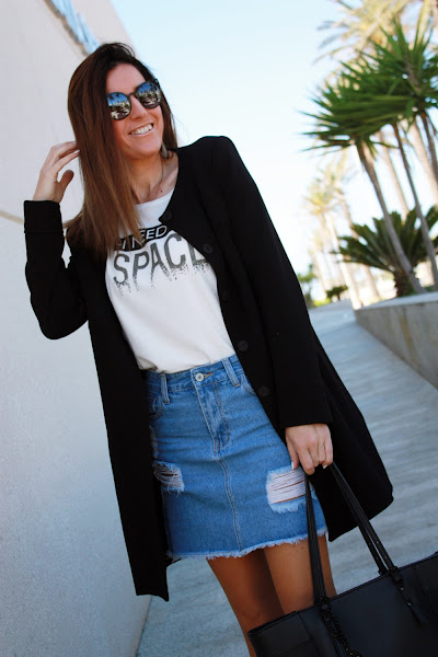 Camiseta mensaje y falda denim completan un outfit perfecto para el día día.