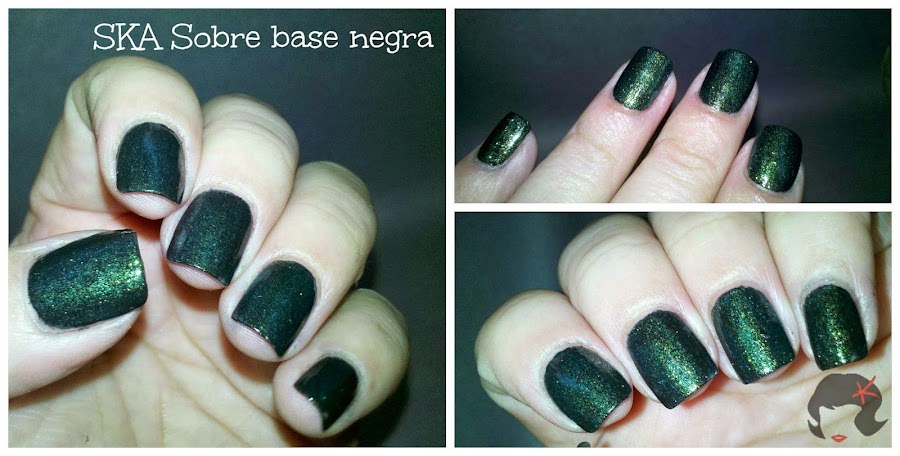 Si lo tengo que definir es un verde aturquesado, aunque en el frasco es un verde más azulado, si, no estoy loca, para mi es una mezcla rara, quizás por eso gusta tanto, pero debo admitir que en vivo y en directo yo lo noto más verde, creo que quizás sea por todo ese dorado que enamora en Ska se nota tanto el cambio en el color, entre la botella y la uña.