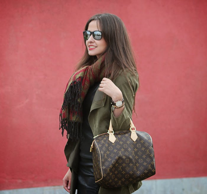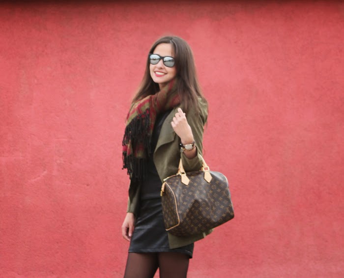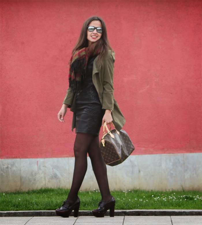 El resto de prendas son de sobra conocidas, vestido negro de polipiel (que ya me visteis aquí), pashmina bien grandota ya que por el norte cuando cae la tarde siempre refresca, unos de mis zapatos preferidos no sólo por el diseño que me encanta sino porque son ultra cómodos y un clásico mí adorado speedy que casa a la perfección con las parkas militares. ¿Qué os parece el resultado?