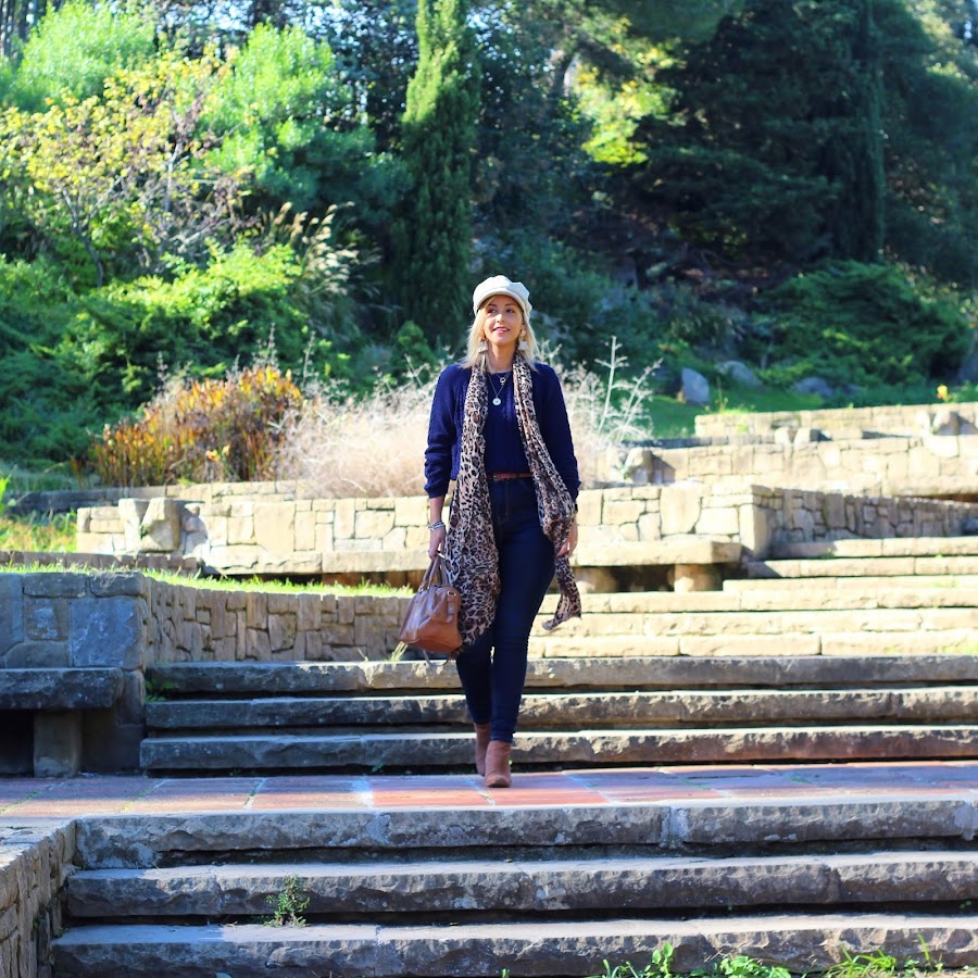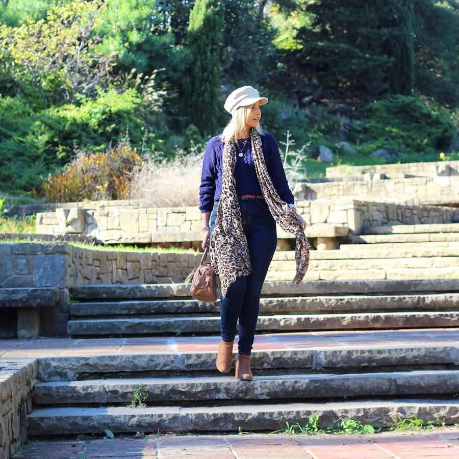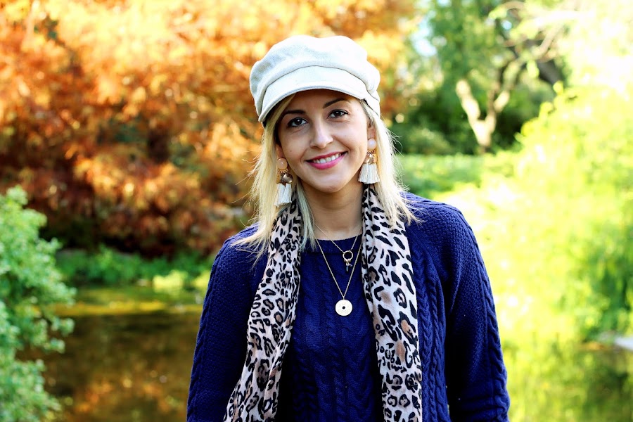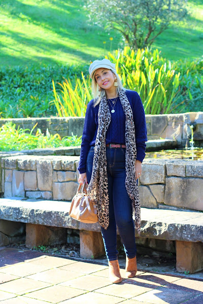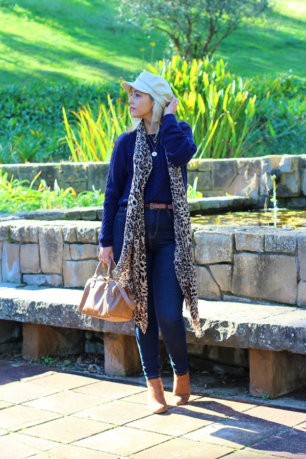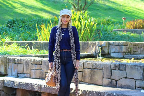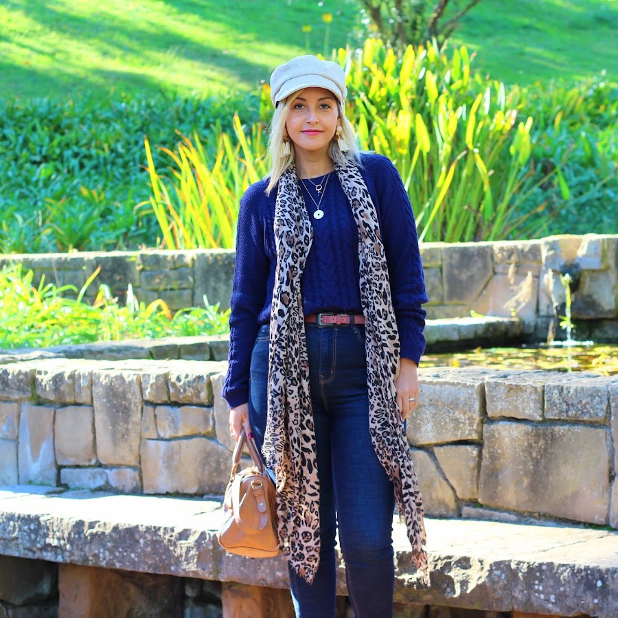 Hoy os traigo un look super sencillo con prendas que estoy segura que todas tenéis en vuestro armario. En el look de hoy llevo un jersey de punto azul que combine con unos jeans. Para darle un toque chic al look, añadí un foulard con estampado de leopardo y una gorra beige. El resto de accesorios fueron unos botines marrones y un bolso del mismo color. Un look que nunca pasa de moda y perfecto para mil y una ocasiones.