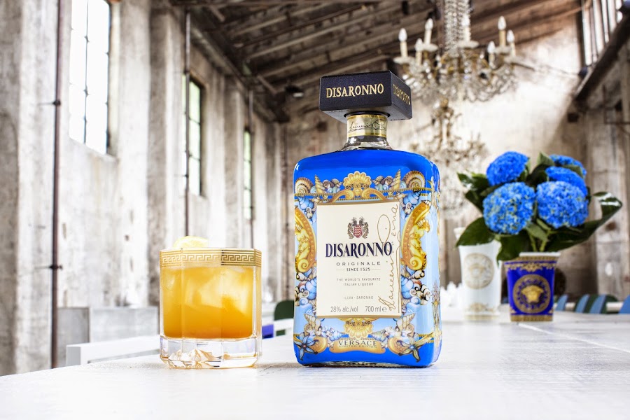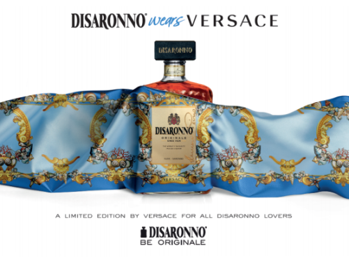 Is on sale last Diseronno limited edition for this occasion Disaronno dess on blue and gold silk and marine motifs such as shells and corals fresh from the sea, true to the Versace DNA that is responsible for this collaboration this year, the previous edition was provided by Moschino, that you can see here.