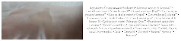 Lo que dice la web: Contiene pétalos de rosa, flores de hibisco, ceramidas, escualano, elmendras y proteínas del trigo. Además contiene aceites antienvejecimiento, tales como semillas de lino, salvado de arroz y semillas de sésamo, que regeneran tu piel de forma natural. Todos estos ingredientes armonizan y mejoran la apariencia de la piel, para un tono igualado y liso. proporcionando una tez uniforme, lisa y sin manchas. El afrodisiaco geranio y la palmarosa animan, otorgando alegria y energía.