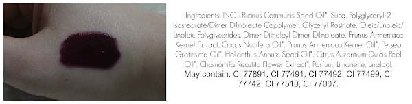 No podía ser otro color ¿verdad? jajaja y qué le hago si me pierden los morados... Creo que es la primera vez que tengo un labial en este formato (boli, no esponja) y me está resultando interesante. La textura es muy cremosa y altamente pigmentada, algo que me encanta. Su olor es normal, estamos tan acostumbrados a que nos huelan a vainilla que cuando encontramos uno que apenas huele a nada se hace hasta extraño. Lo que no me convence mucho es su duración, acostumbrada a los labiales mate y de alta durabilidad, este te puede llegar a durar 2 o 3h intacto y siendo un color tan oscuro es algo muy peligroso. Lo he probado con el preparador labial y aguanta algo más pero en cuanto comes o bebes... ¡adiós! una pena la verdad porque de verdad os digo que el color es una pasada.