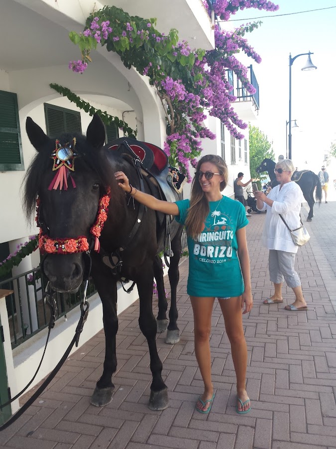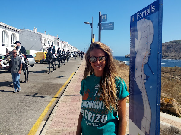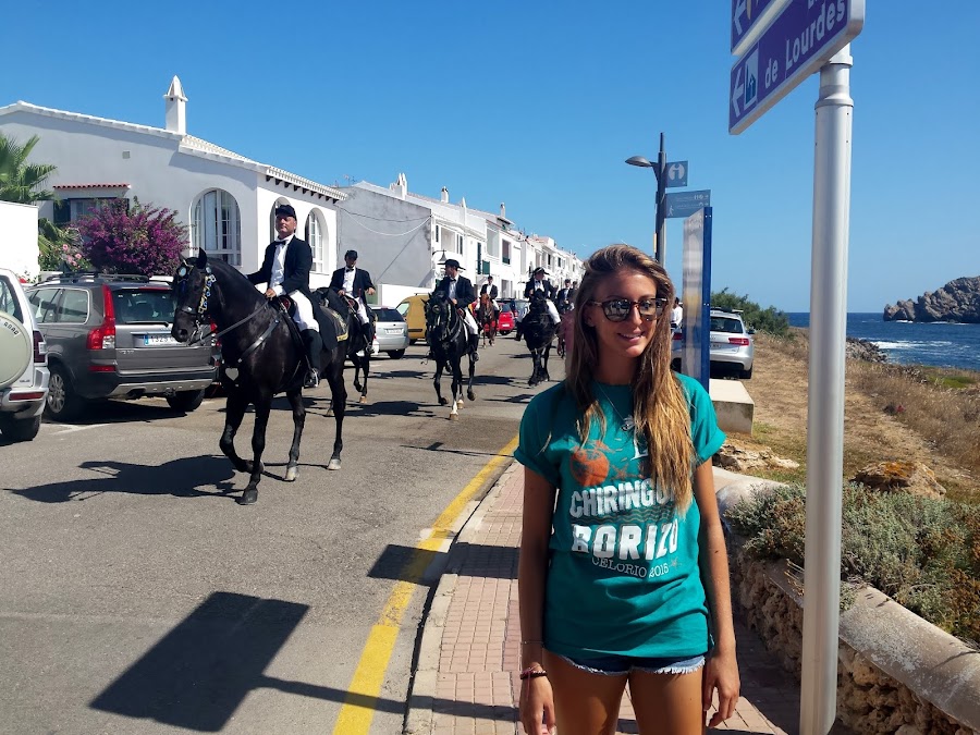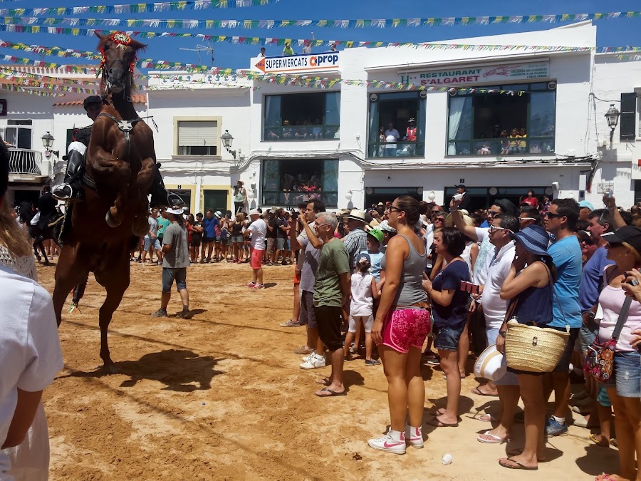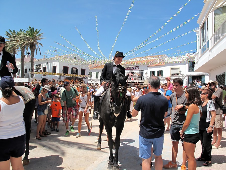 Estoy en el precioso pueblo de Fornells, es tradición en la isla que en las fiestas de los pueblos se celebre el Jaleo. Los jinetes (caixers), vestidos de blanco y negro, van sobre sus caballos por las calles del pueblo, hasta que una vez recogidos todos y después de la misa, se celebra el tradicional jaleo (no debe confundirse con el jaleo, cante y baile flamenco).