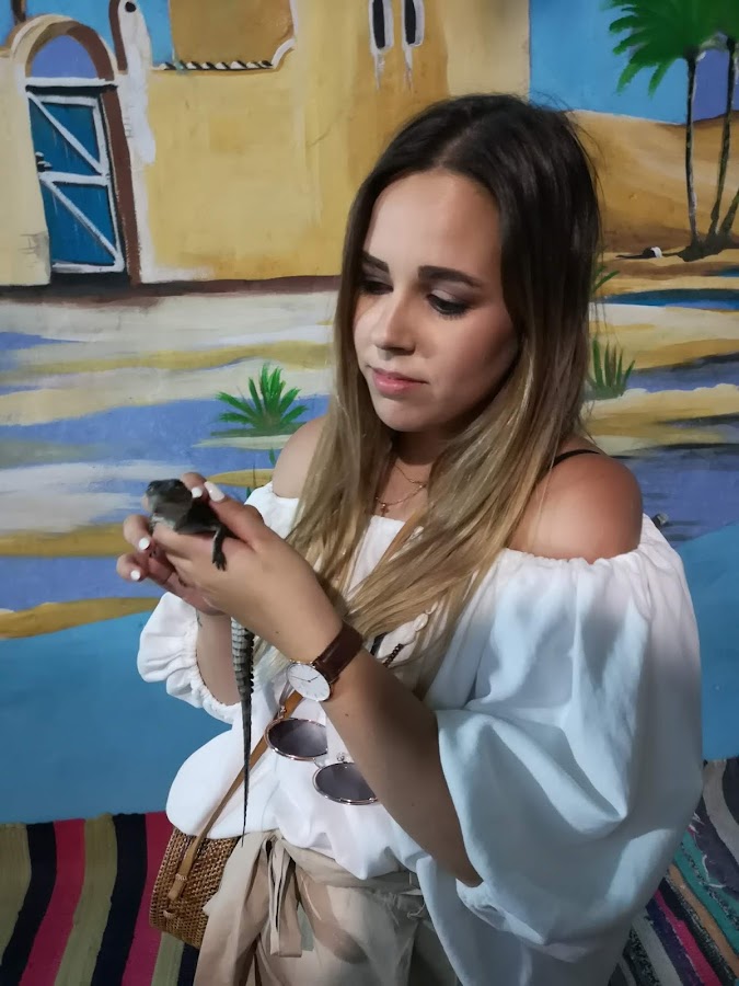 Después de eso llegamos a una especie de playa que hay en una orilla del Nilo y tuvimos un rato para darnos un baño. En Egipto hace mucho calor, pero el agua del río está helada. Nos cambiamos y nos preparamos para un paseo en camello hasta el propio poblado. Una vez allí, tomamos algo y fumamos una shisha, vimos y cogimos a los cocodrilos que tienen como mascota y nos hicimos un tatuaje de hena (todo incluido en el precio).