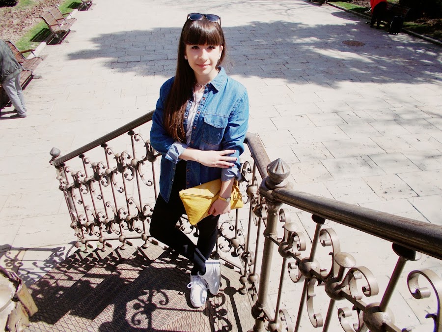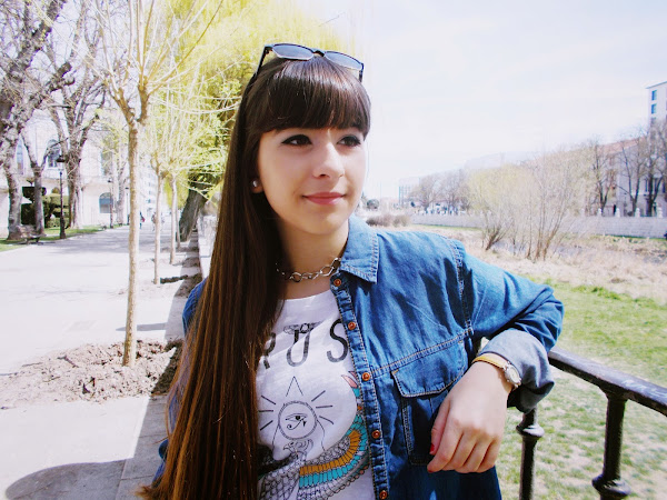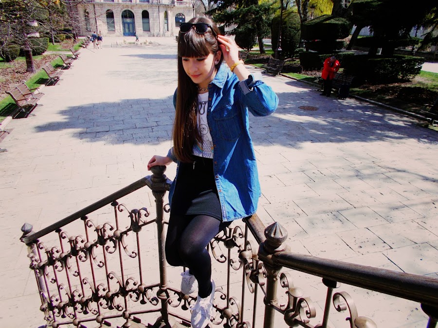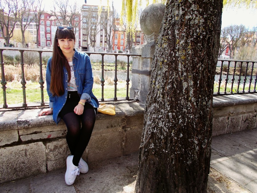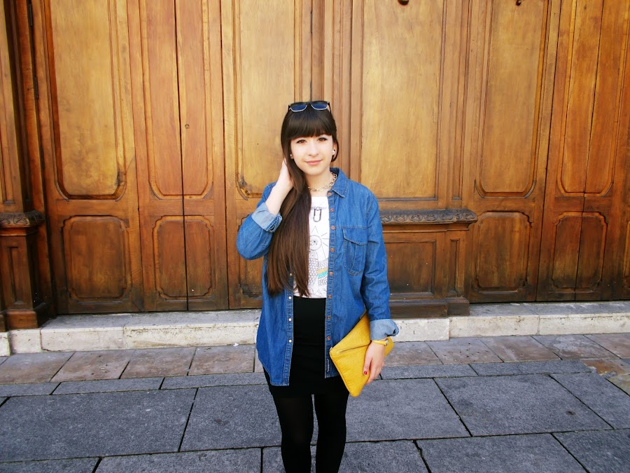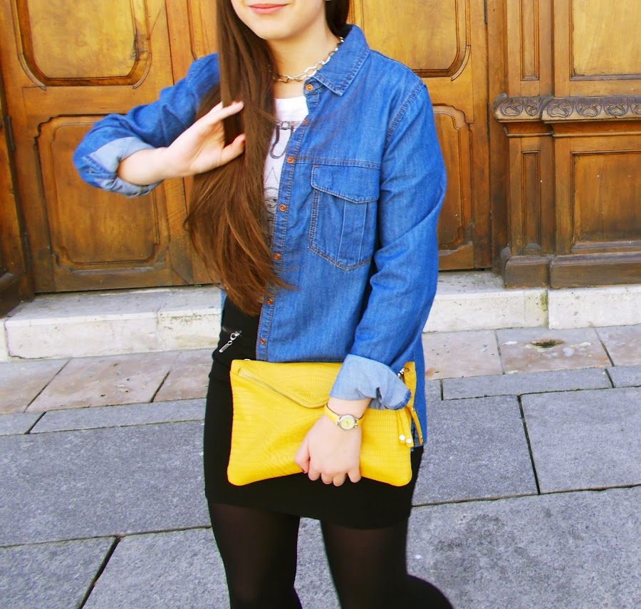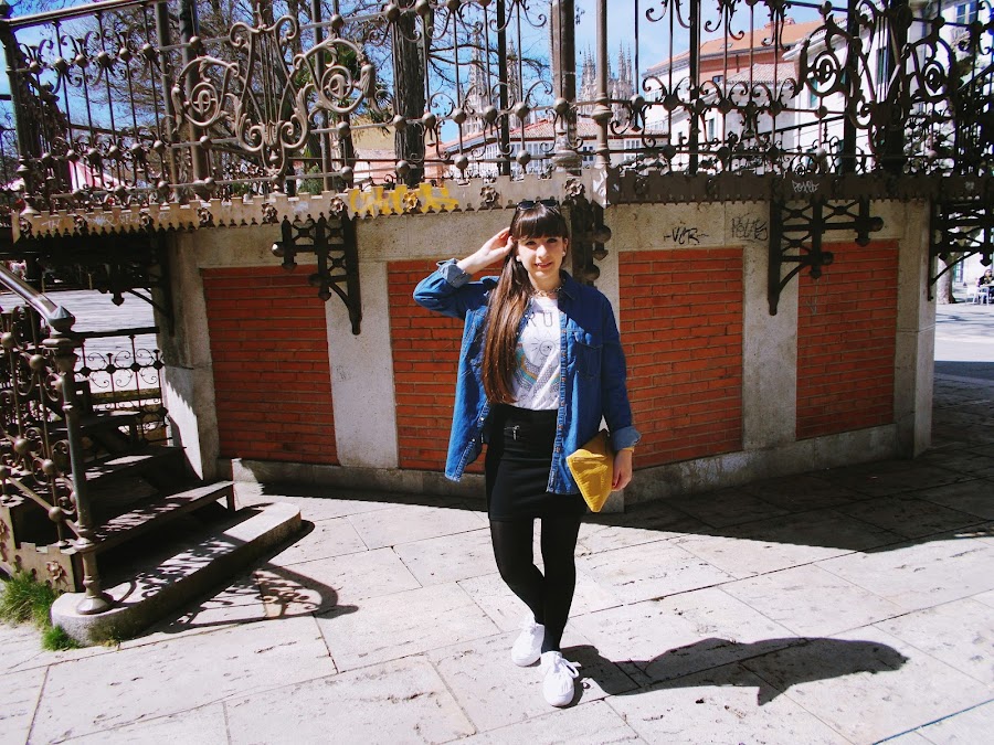 Quería ir arreglada pero informal, de ahí la combinación falda con zapatillas de plataforma, y una de mis camisetas preferidas con un clutch que no pasa desapercibido acompañado de mis queridas gafas y mi nueva camisa vaquera que me encanta.