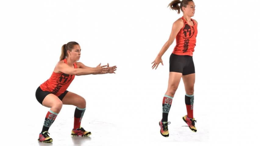 Nos colocaremos de pie con las piernas ligeramente abiertas a la altura de nuestras caderas. Desde esta posición flexionaremos ligeramente las rodillas hasta hacer una sentadilla pero en lugar de subir nuestro cuerpo de forma habitual daremos un salto hasta volver a la posición de sentadilla.