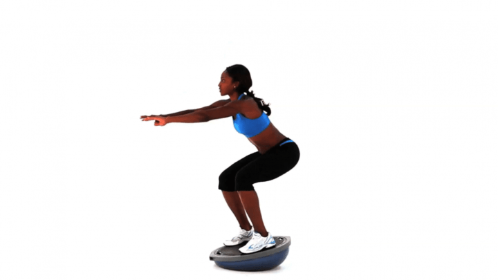 Realizaremos sentadillas de la manera habitual pero más pausadamente, centrándonos en nuestro equilibro y en el trabajo de nuestros glúteos. Permaneceremos en esta postura un par de segundos hasta volver a la posición inicial.