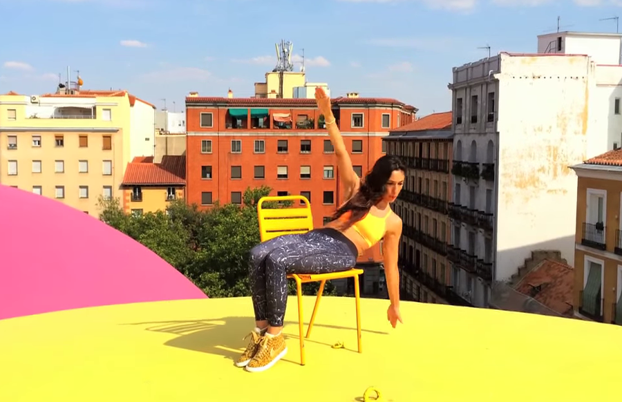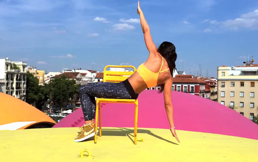 Vamos a trabajar los oblícuos de una forma muy fácil. Empieza sentándote en una silla y girando el tronco a un lado, tal y como aparece en la imagen. Ahora, baja intentando que la mano toque el suelo mientras levantas la otra. Repite el mismo movimiento hacia el otro lado.
