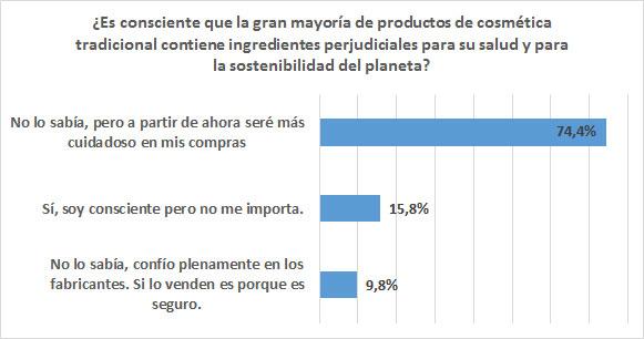 Este estudio, llevado a cabo entre los internautas y usuarios de Espaciobio, también revela que casi el 16% sí es consciente de los posibles efectos negativos de dichos ingredientes pero que, a pesar de ello, no le importa y seguirá comprando sus productos cosméticos habituales. Además existe casi un 10% de consumidores que confían plenamente en la marca, considerando que si los productos se venden es porque son seguros.