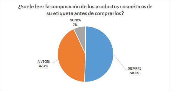En este sentido, el 50% de los encuestados afirma leer siempre la etiqueta en la que figura la composición de los cosméticos que compra mientras que el otro 50% no lee la etiqueta o sólo lo hace en ocasiones.