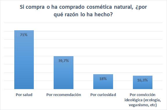 La salud es la principal razón por la que los consumidores compran cosmética natural (71%). También las recomendaciones de amigos y familiares (39,8%) y las convicciones ideológicas (16,9%) – ecología, veganismo, etc.- son otras de las principales motivaciones de compra de este tipo de cosmética.