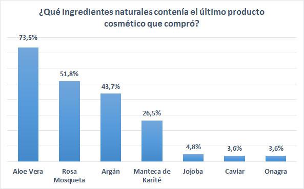 La encuesta también pone de relieve los ingredientes naturales más habituales entre los compradores de cosmética. Un 73,5% de los encuestados reveló que su última adquisición cosmética contenía Aloe Vera. Le siguen la Rosa Mosqueta (51,2%), el Aceite de Argán (43,4%) y la Manteca de Karité (26,51%).