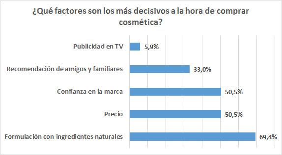 Por otro lado, en cuanto a los factores clave a la hora de elegir un producto cosmético, el precio y la confianza en la marca ocupan los primeros lugares aunque es la formulación con ingredientes naturales el factor número 1 para decidirse por un producto determinado.
