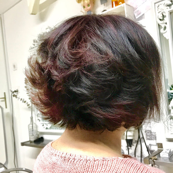 Tomad nota si os gusta. Lleva mechas violetas con un corte fresco y juvenil, desfilado y cortado en forma cóncava, dejando la nuca despejada.