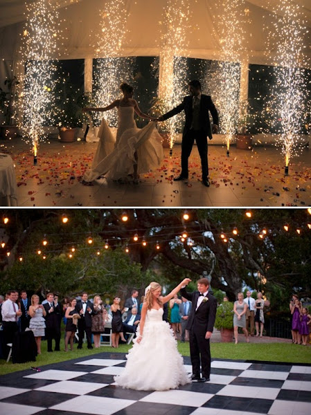Decorate the dance floor with lighting and lanterns, flares, as we discussed in previous post, a projection on the ground as stars, the initials of the bride and groom throwing petals, soap bubbles ...