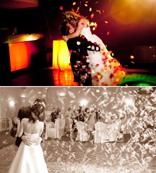 Decorar la zona de baile con iluminacion como farolillos, bengalas, como ya hablamos en post anteriores, alguna proyección sobre el suelo como estrellas, las iniciales de los novios, lanzar pétalos, pompas de jabón...