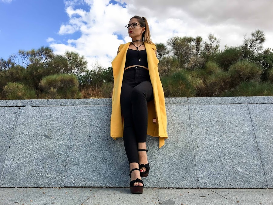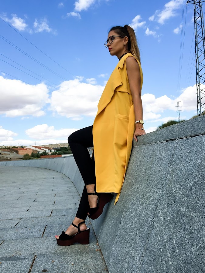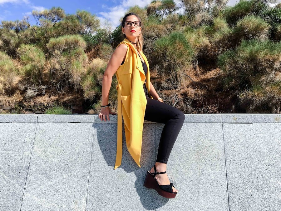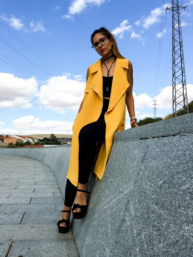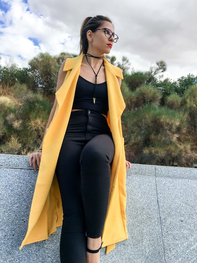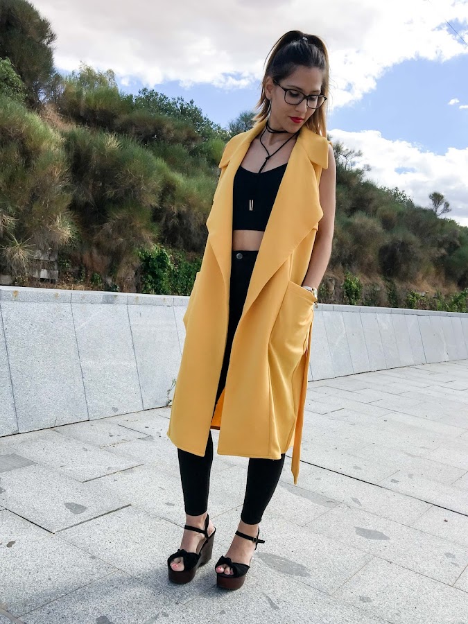 Lo he combinado con un look total black para que resalte más el color mostaza del chaleco.