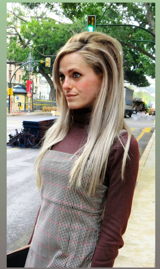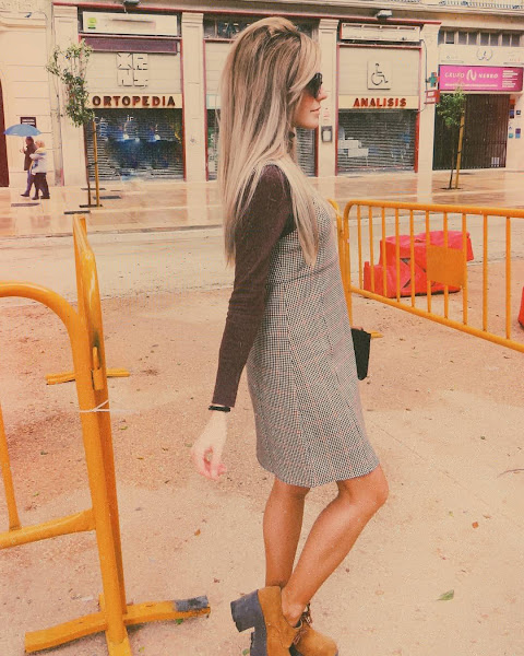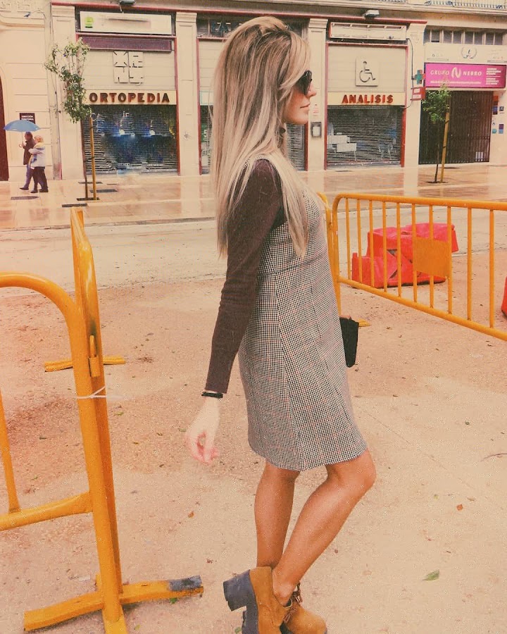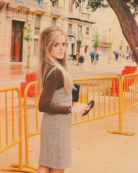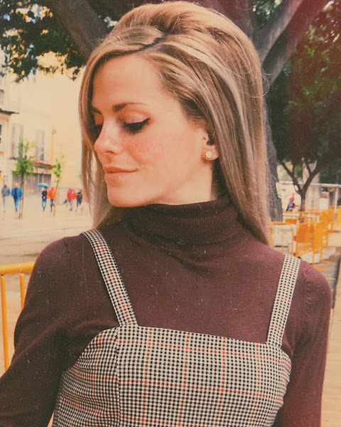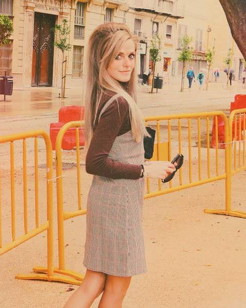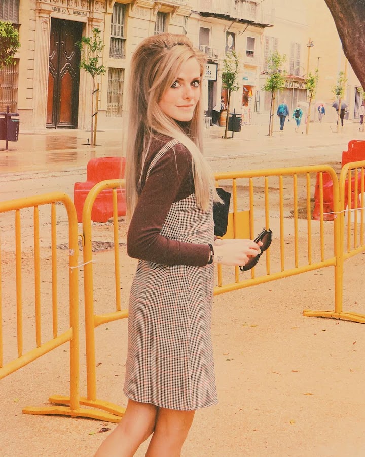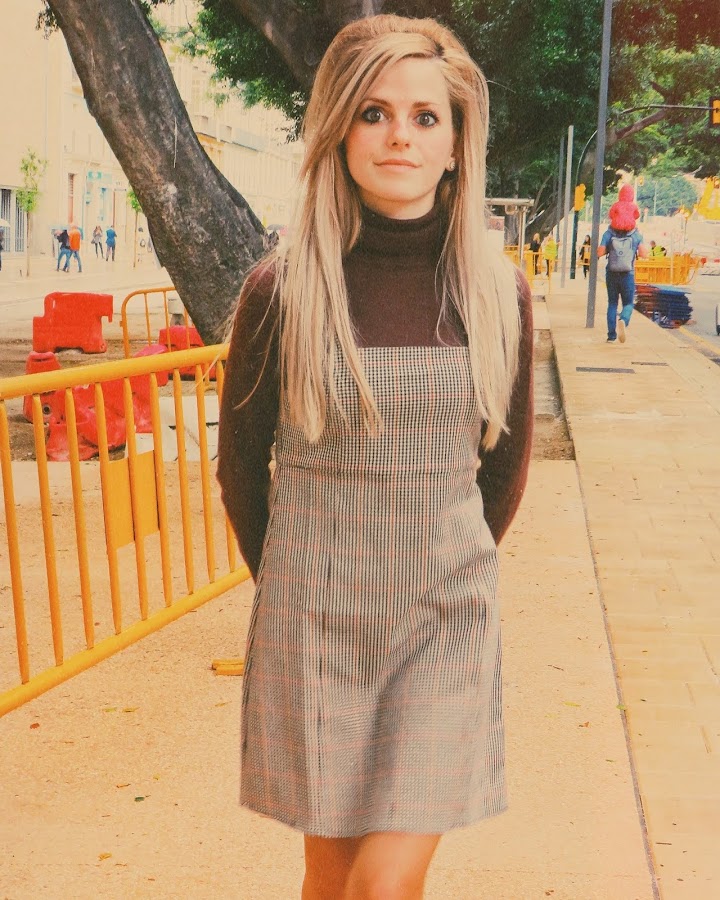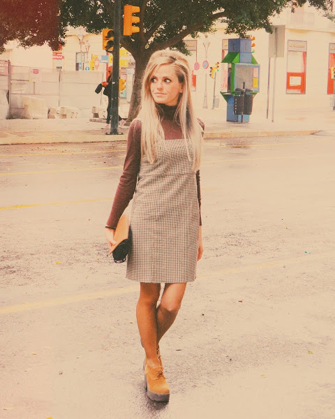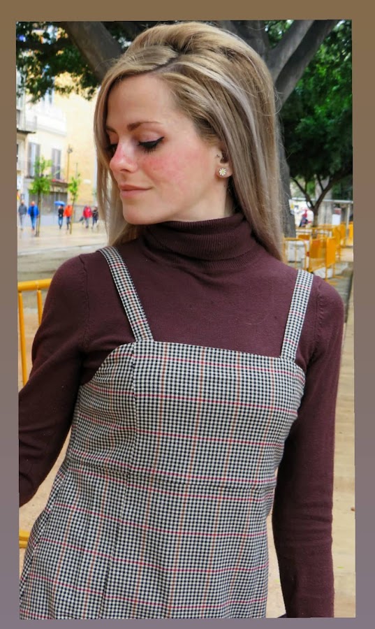 Una prenda clave para un look de esta década, es el pichi, también llamado peto, o simplemente vestido. La particularidad de esta prenda es el poder llevarla con ropa debajo, como por ejemplo, un jersey de cuello alto, medianamente ceñido al cuerpo. Así es como decidí ir aquel día, con mi pichi de estampado pata de gallo en tonalidades cálidas, mi jersey marrón y mis zapatos camel. Sin olvidar, obviamente, mi peinado y maquillaje acorde.