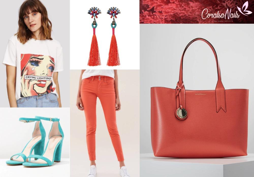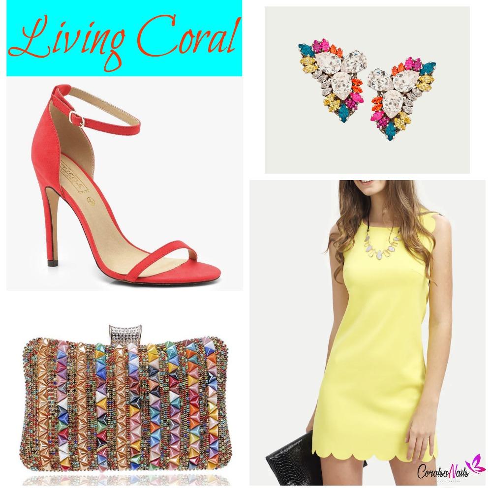 Lo más habitual es combinarlo con negro, que como ya sabemos es un color muy socorrido y nos saca de mil apuros, pero queda también muy bonito con otros tonos neutros, como pueden ser el blanco, grises y beiges. Para hacer combinaciones con la manicura, joyas, bisutería y otros complementos, o para las más atrevidas, también hay otros colores que pueden funcionar y quedan muy con el Living Coral. Queda genial con amarillo, verde agua, caqui, azul klein, turquesa, metalizados y con naranjas que vayan en una línea de color similar. Os dejo unos ejemplos debajo para que os hagáis una idea de lo bien que quedan con estos colores.