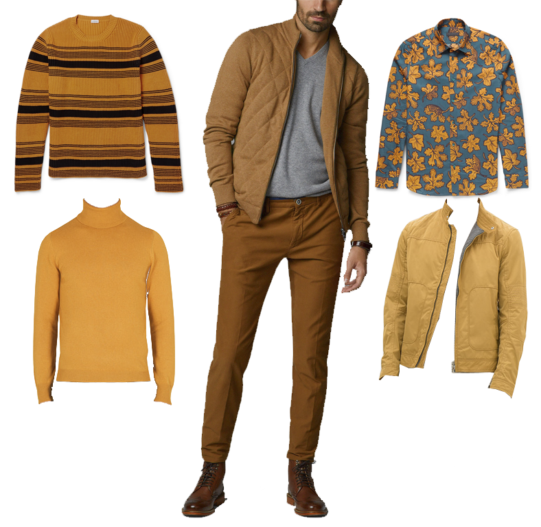 PANTONE 14-0837 Misted Yellow "mostaza". Sweater de rayas de Loewe, sweater cuello alto de Gucci, cazadora acolchada y pantalones de HE by Mango, camisa con print de hojas de Burberry Prorsum y cazadora de Zara.