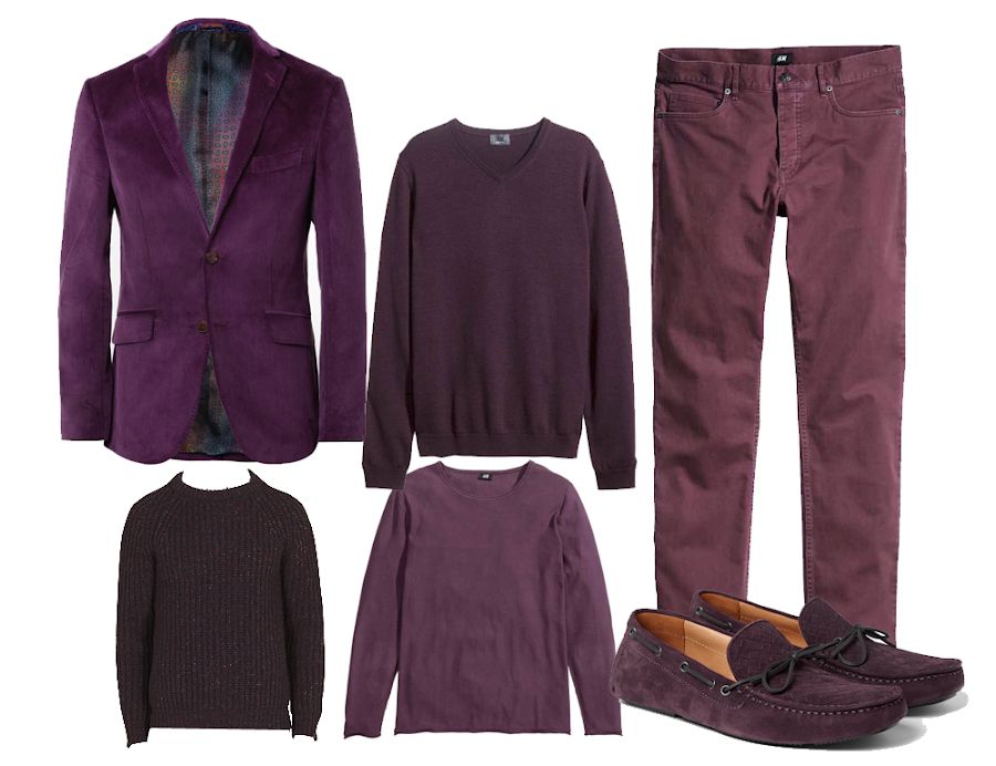 PANTONE 18-3224 Radiant "berenjena". Blazer de Etro, sweater de punto grueso de Gucci, el resto de prendas son de H&M, y los zapatos de Bottega Veneta.