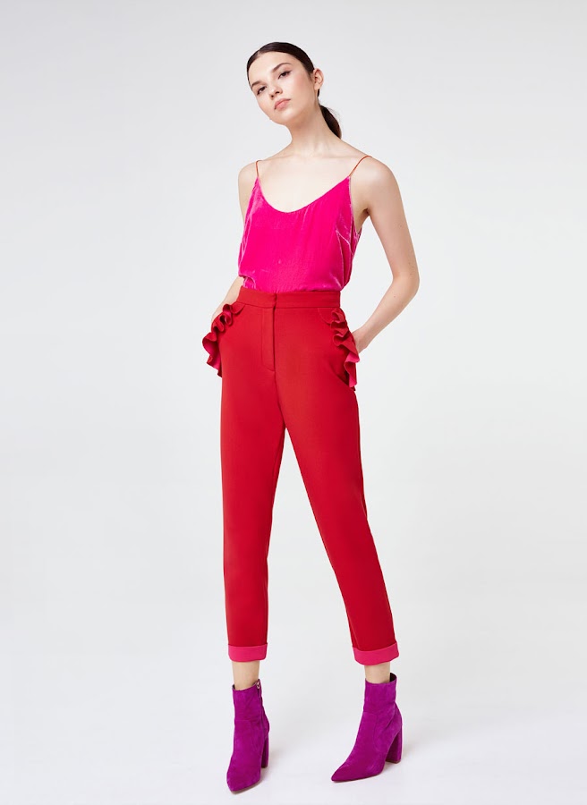 Si prefieres pantalón, en la redacción estamos enamoradas de este rojo con volantes y ribete en rosa, combinado con top de terciopelo fucsia y botín morado